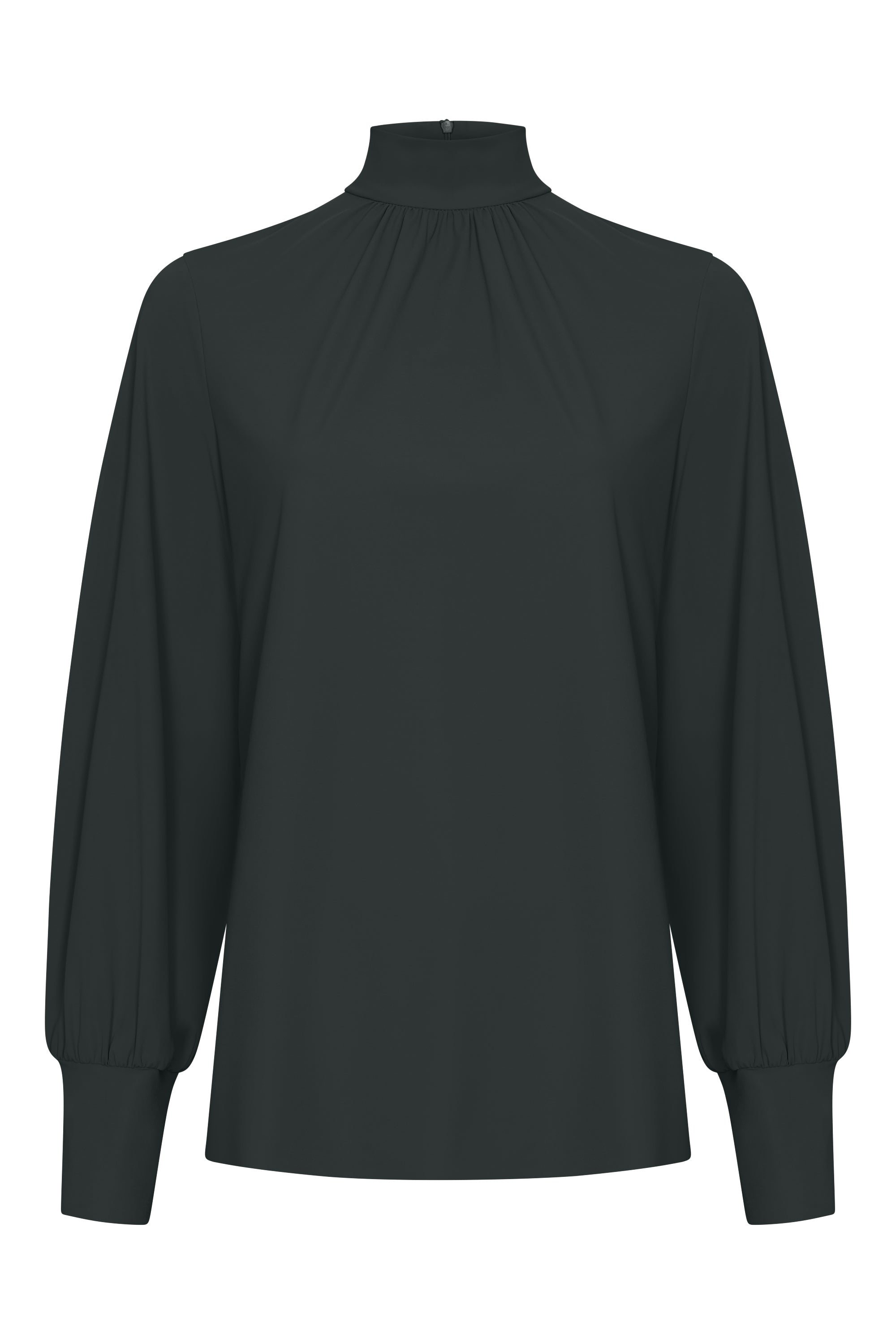 This blouse features a high neck with subtle gathering details that add a touch of elegance. It features a back zipper, making it easy to put on. The long sleeves are finished with fitted cuffs, enhancing the elegant look.