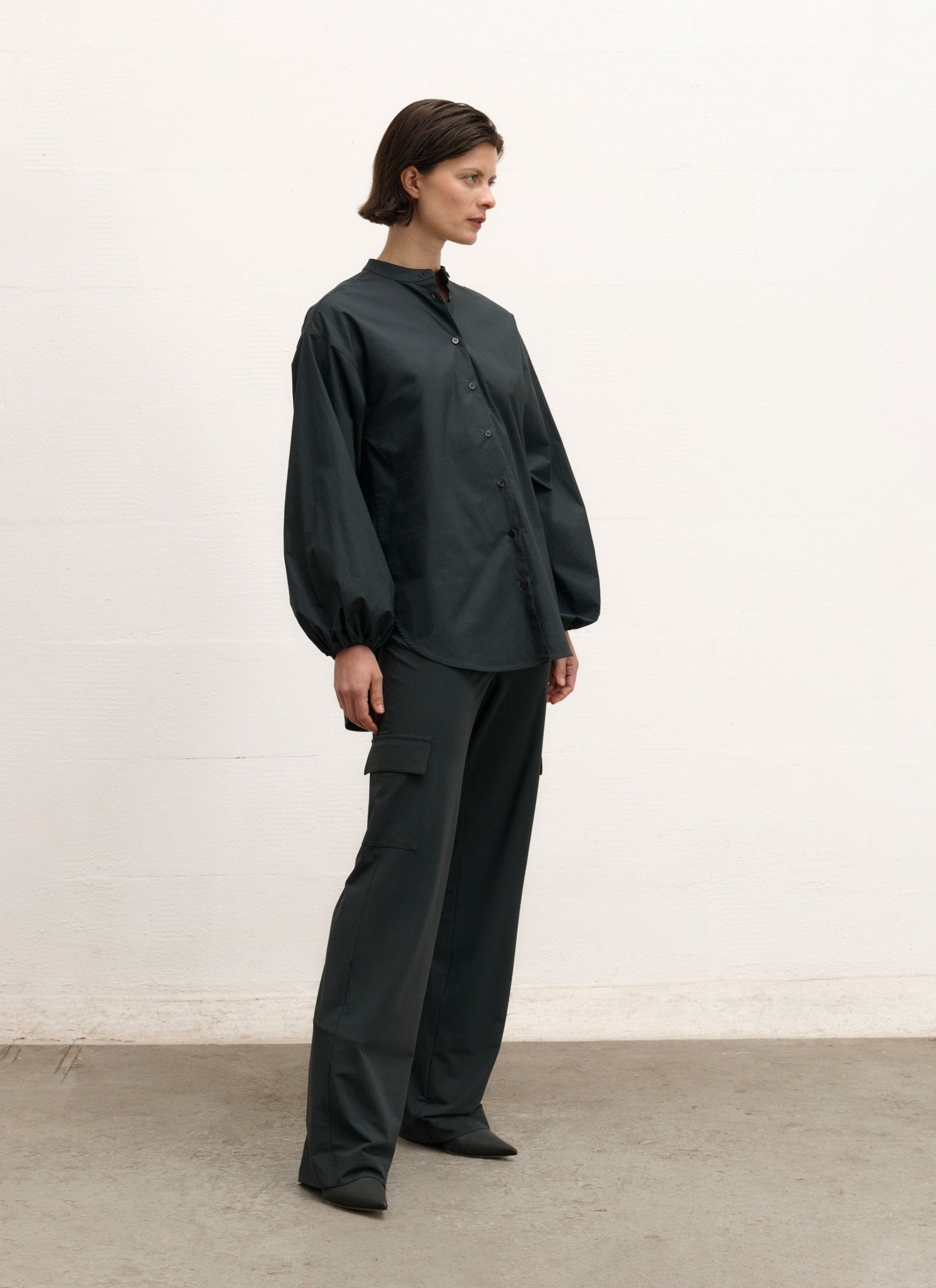 Die Tokiyo-Bluse hat eine entspannte Passform mit Stehkragen und Knopfleiste vorne. Die langen Ärmel sind mit elastischen Bündchen versehen, die dem Gesamtlook Volumen verleihen. Der weiche und dehnbare Baumwollstoff sorgt für Komfort und Bewegungsfreiheit.
