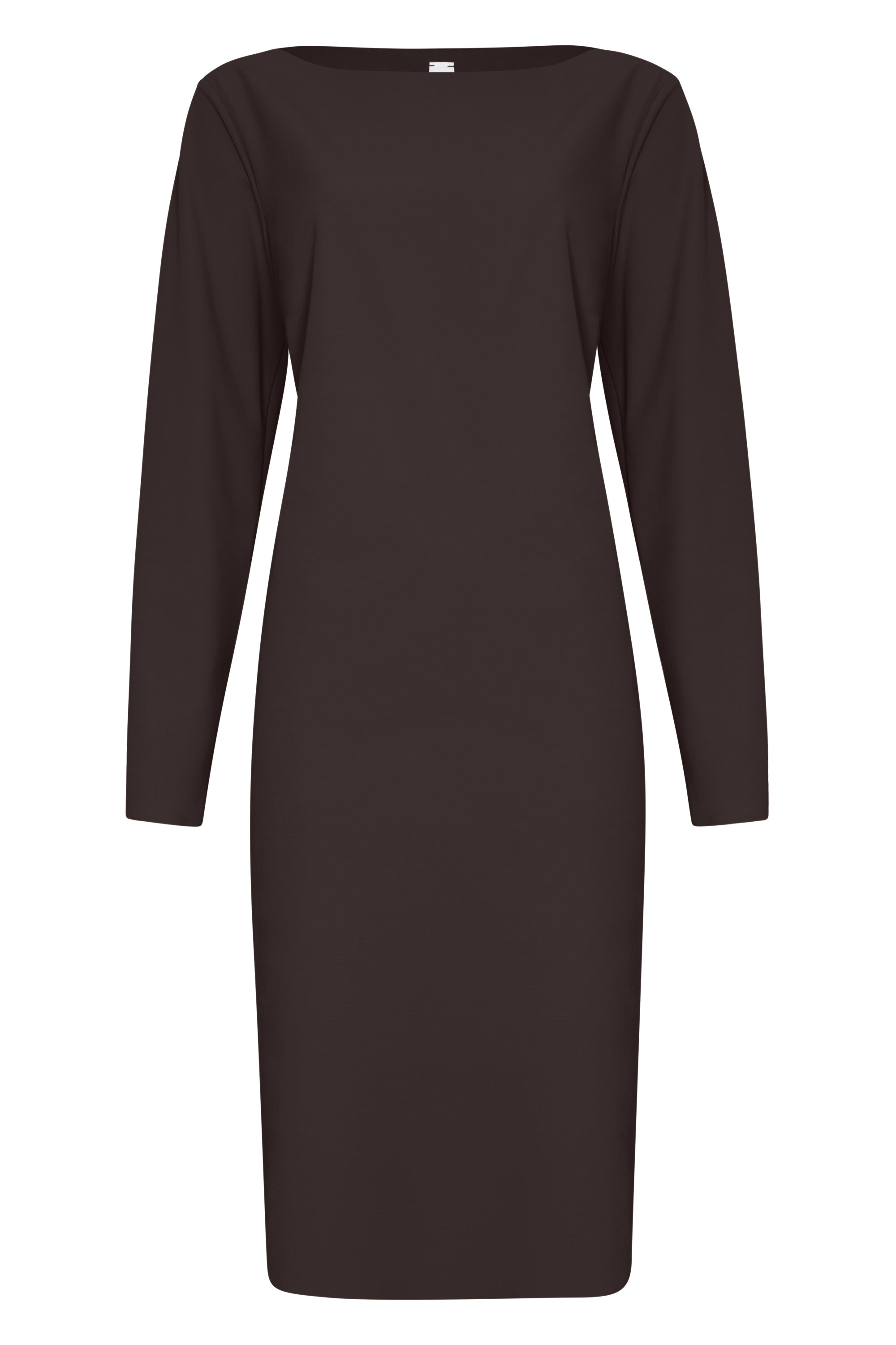 The Rohi dress in heavy travel fabric offers a timeless midi-length silhouette with long sleeves and a round neckline. A center-back seam adds subtle detail and structure, giving the design an elegant finish.