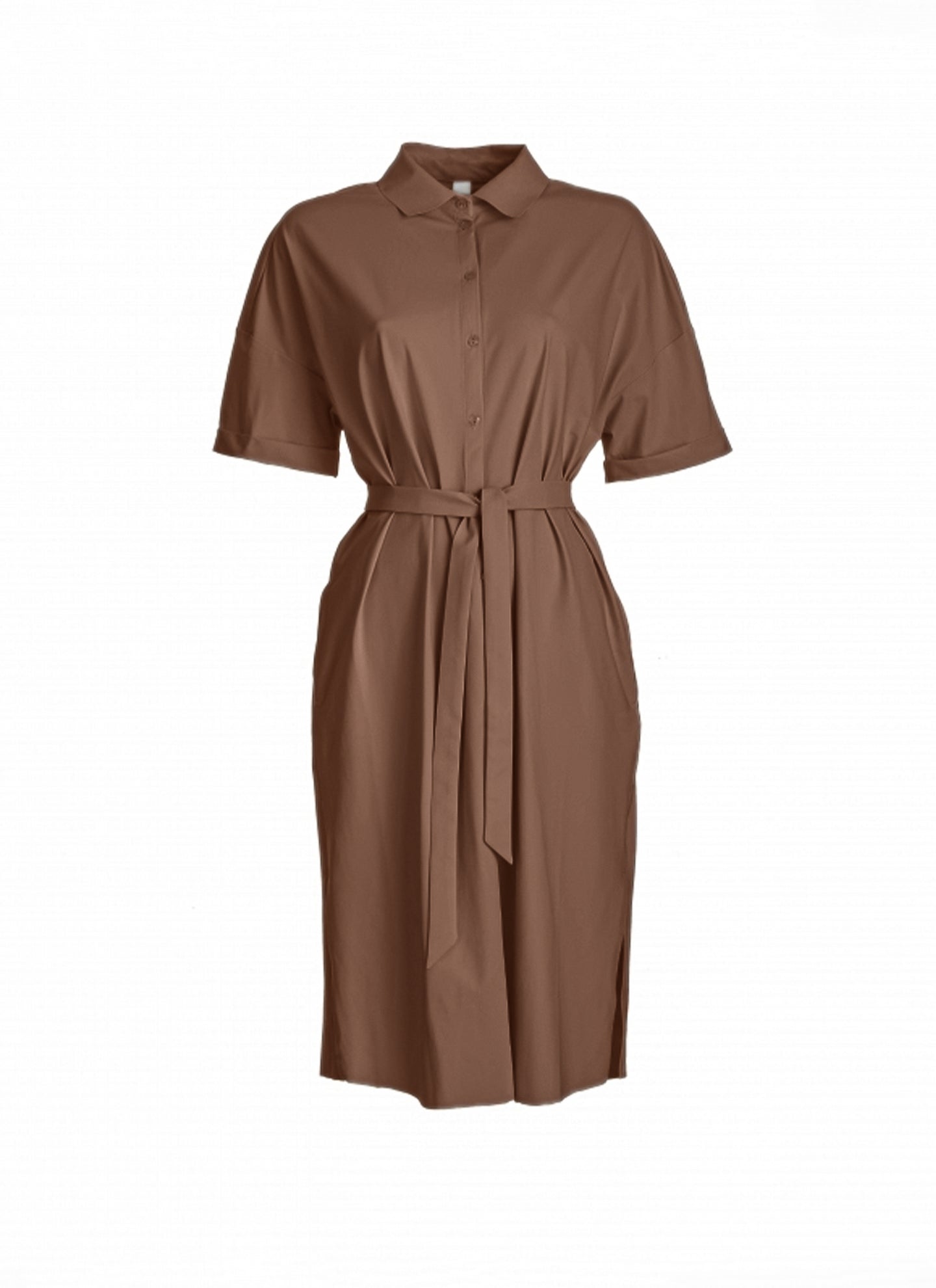 Discover the ultimate fusion of comfort and style with this versatile short-sleeve belted dress in maple brown, crafted from our signature regular travel jersey fabric. Lightweight and wrinkle-resistant, this dress is ideal for effortless elegance, whether you're at the office or traveling. The tailored design features a classic button-up front and a detachable belt to enhance your silhouette. Its breathable and low-maintenance fabric ensures that you stay comfortable throughout the day. Pair it with sneakers for a casual look or elevate it with heels for a more polished style.