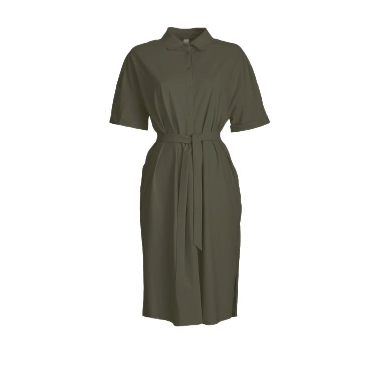 Discover the ultimate fusion of comfort and style with this versatile short-sleeve belted dress in veggie, crafted from our signature regular travel jersey fabric. Lightweight and wrinkle-resistant, this dress is ideal for effortless elegance, whether you're at the office or traveling. The tailored design features a classic button-up front and a detachable belt to enhance your silhouette. Its breathable and low-maintenance fabric ensures that you stay comfortable throughout the day. Pair it with sneakers for a casual look or elevate it with heels for a more polished style.