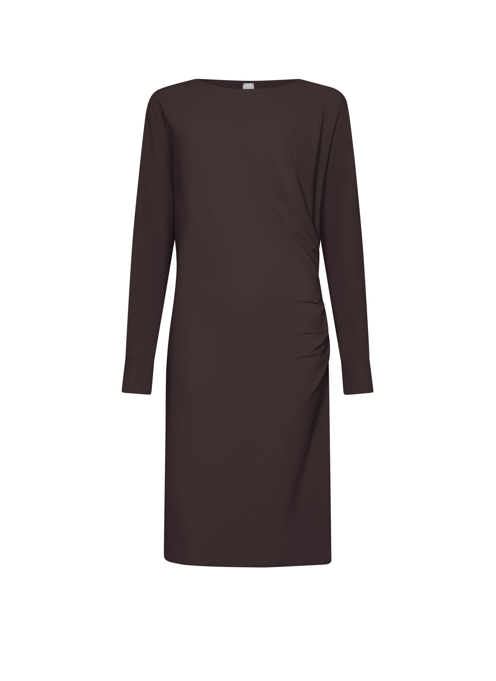 Das Shizuo Kleid ist dafür gemacht, Eindruck zu hinterlassen. Der fließende Travel Jersey bringt die Drapierungen perfekt zur Geltung. Lange Ärmel, ein U-Boot-Ausschnitt und knielange Länge runden den stilvollen Look ab.