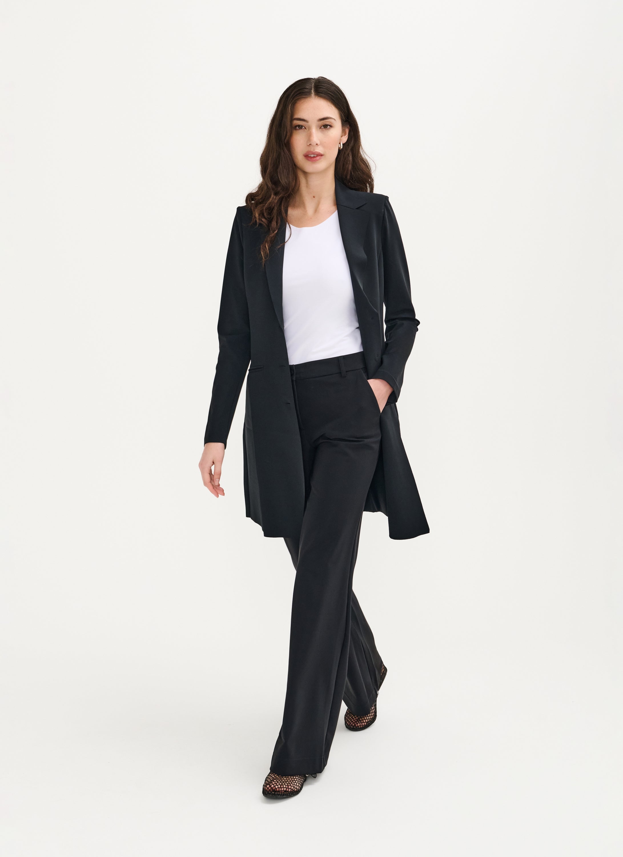Der Luna-Blazer in tiefschwarz ist die perfekte Kombination aus Stil und Vielseitigkeit. Entworfen, um sowohl als Jacke als auch als Blazer getragen zu werden, ist dieses lang geschnittene Teil ein Muss für jede Garderobe. Der tiefe Ausschnitt und die dezenten Taschen verleihen einen raffinierten Touch, während der Schlitz im Rücken die Bewegungsfreiheit erhöht und eine elegante Silhouette schafft. Aus hochwertigem Travel-Jersey gefertigt, bietet dieser Blazer außergewöhnlichen Komfort. Der knitterfreie, atmungsaktive Stoff fühlt sich unglaublich weich an und sorgt dafür, dass du den ganzen Tag über mühelos schick aussiehst.