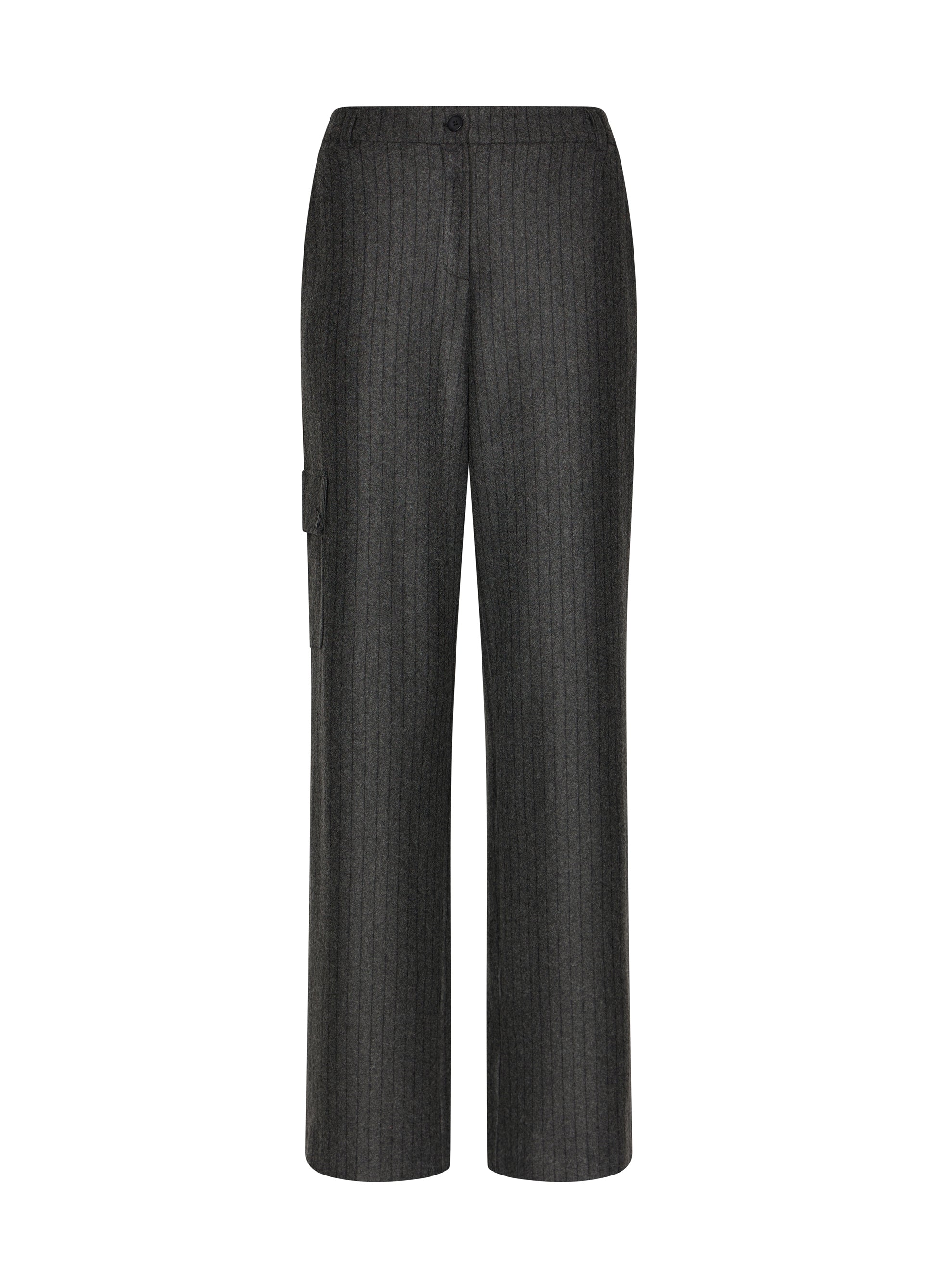 Die Nushi Hose zeigt dezente Cargo Einflüsse, ohne dabei an modischer Eleganz zu verlieren. Die Hose mit weitem Bein besteht aus einem fein gestreiften Jersey Wollmix. Kombinieren Sie sie mit der Celia Jacke oder dem Woky Blazer für ein vollständiges Outfit.