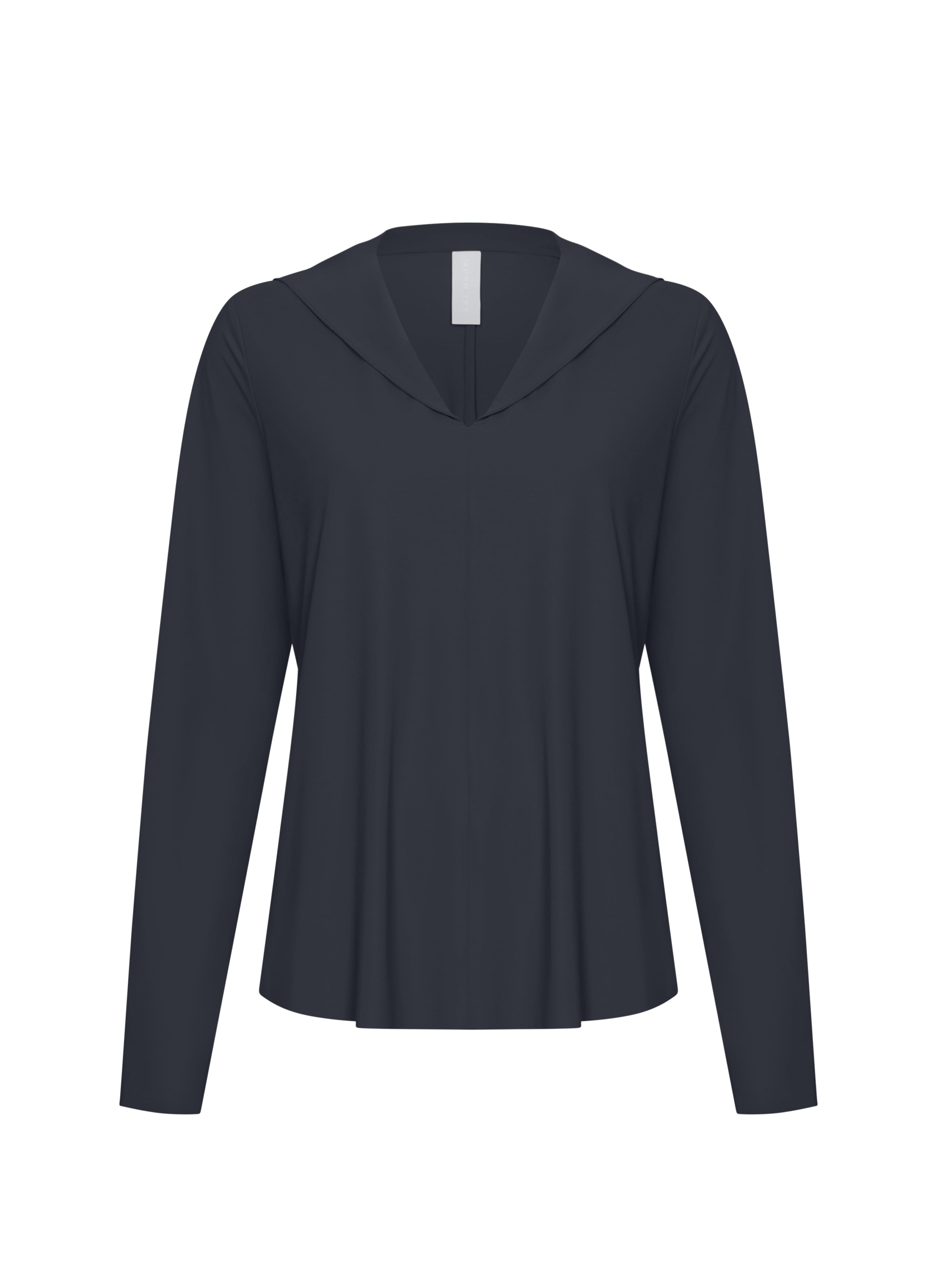 Elegant and lightweight, this black-blue top is made from breathable light travel fabric, offering ultimate comfort and a refined look. Featuring long sleeves and a deep V-neckline, it creates a flattering silhouette. The unexpected touch? A stylish hood at the back, adds a modern edge to this versatile piece. Perfect for layering underneath a blazer or wearing on its own.