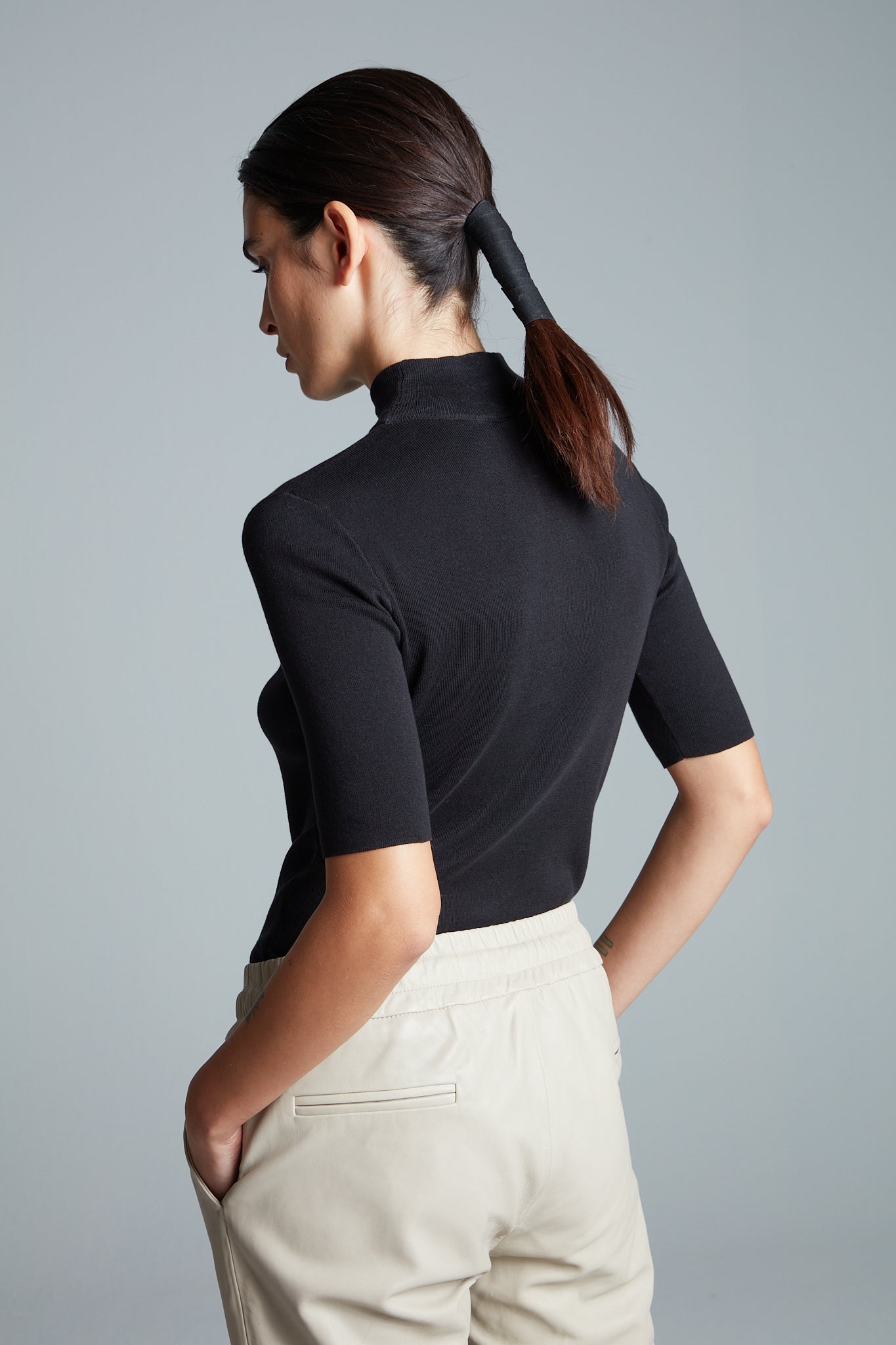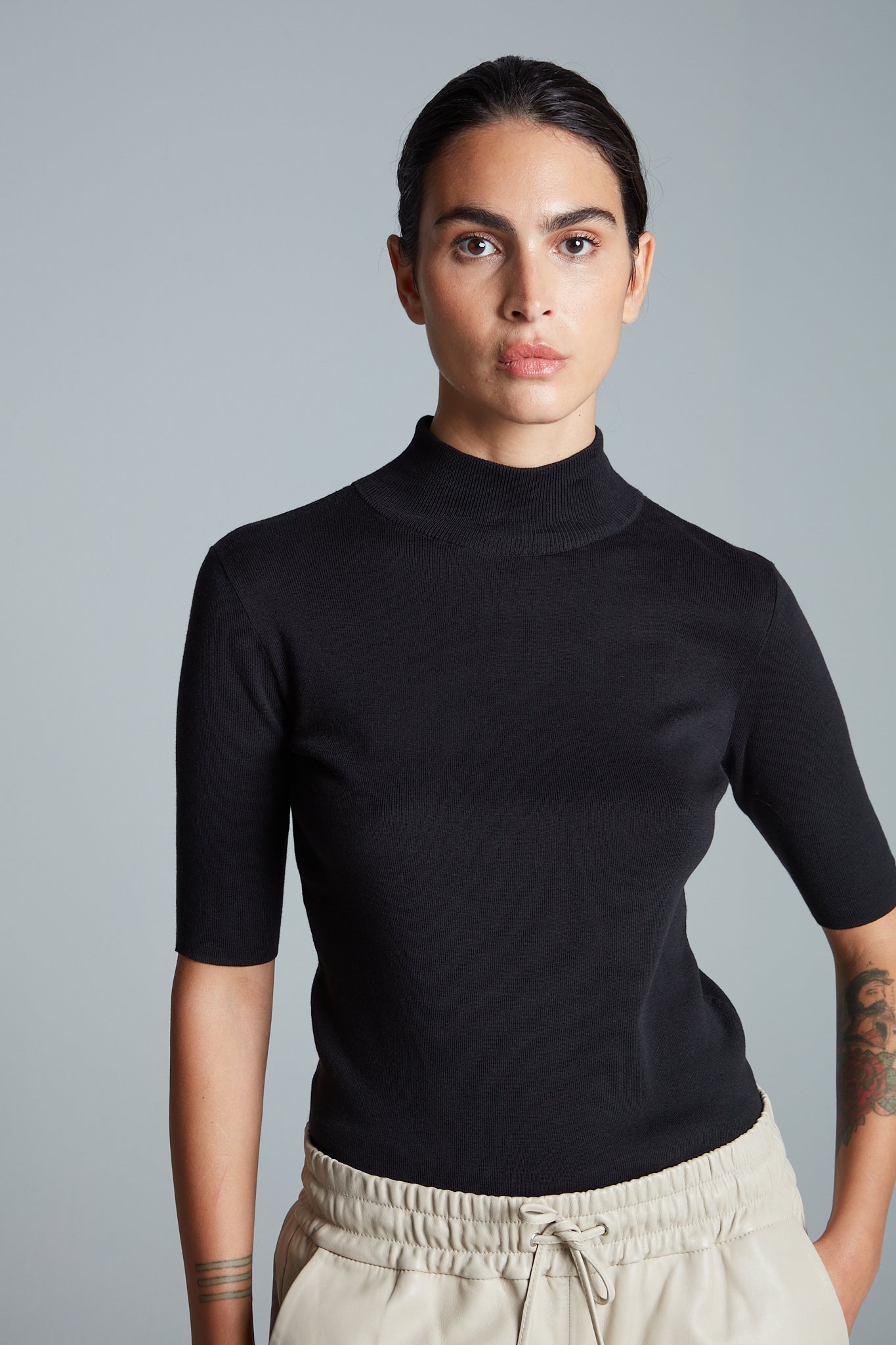 Ein warmer Jumper aus einer Baumwollmischung mit kurzen Ärmeln. Dieser Jumper hat eine bequeme, reguläre Passform mit geripptem Kragen und einer feinen Strickstruktur. Perfekt für Alltagslooks, da er zeitlosen Stil und Komfort vereint. Solo an warmen Tagen oder als Layer für zusätzliche Vielseitigkeit in kälteren Jahreszeiten. Ein essentielles Kleidungsstück für einen mühelosen und modernen Look.