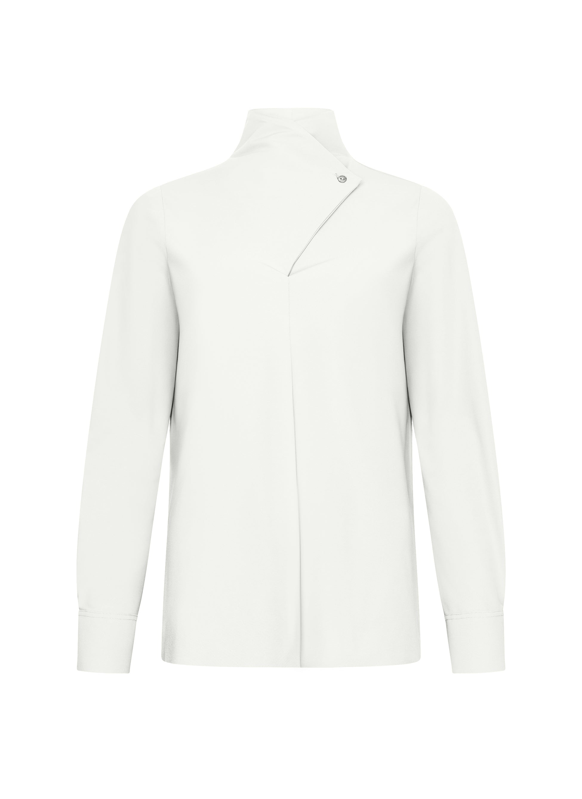 The Matsua blouse is made from Japan TKY’s signature regular travel jersey, lightweight, wrinkle-free, and easy to care for. This modern blouse stands out with its asymmetrical collar that folds over and fastens with a discreet button. A refined twist on a timeless essential, perfect for both business and casual wear.