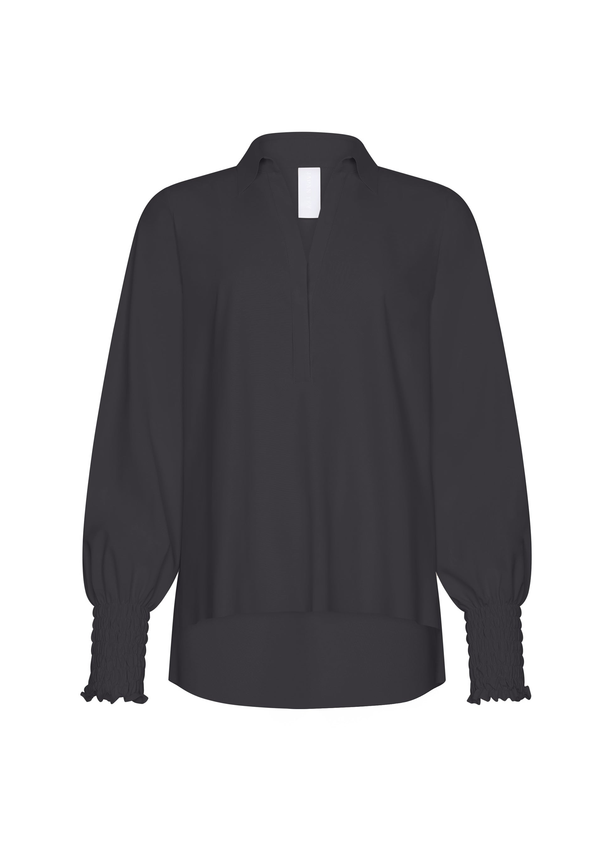 The Yohei blouse is crafted from smooth Regular Travel fabric and blends comfort with character. Featuring a classic collar, short button placket, and smocked cuffs that add volume to the sleeves. The curved hem and straight fit make it a versatile, stylish choice.