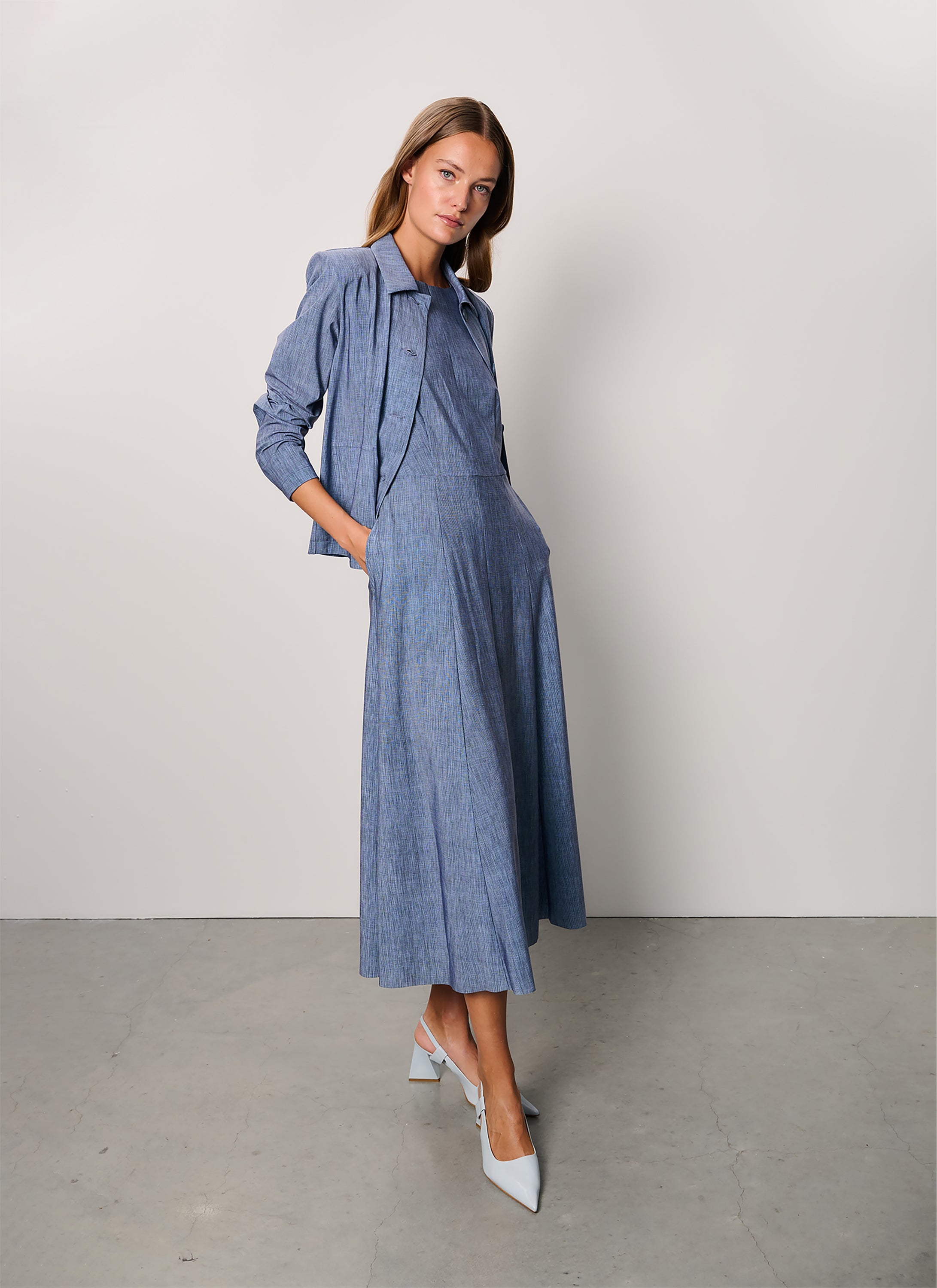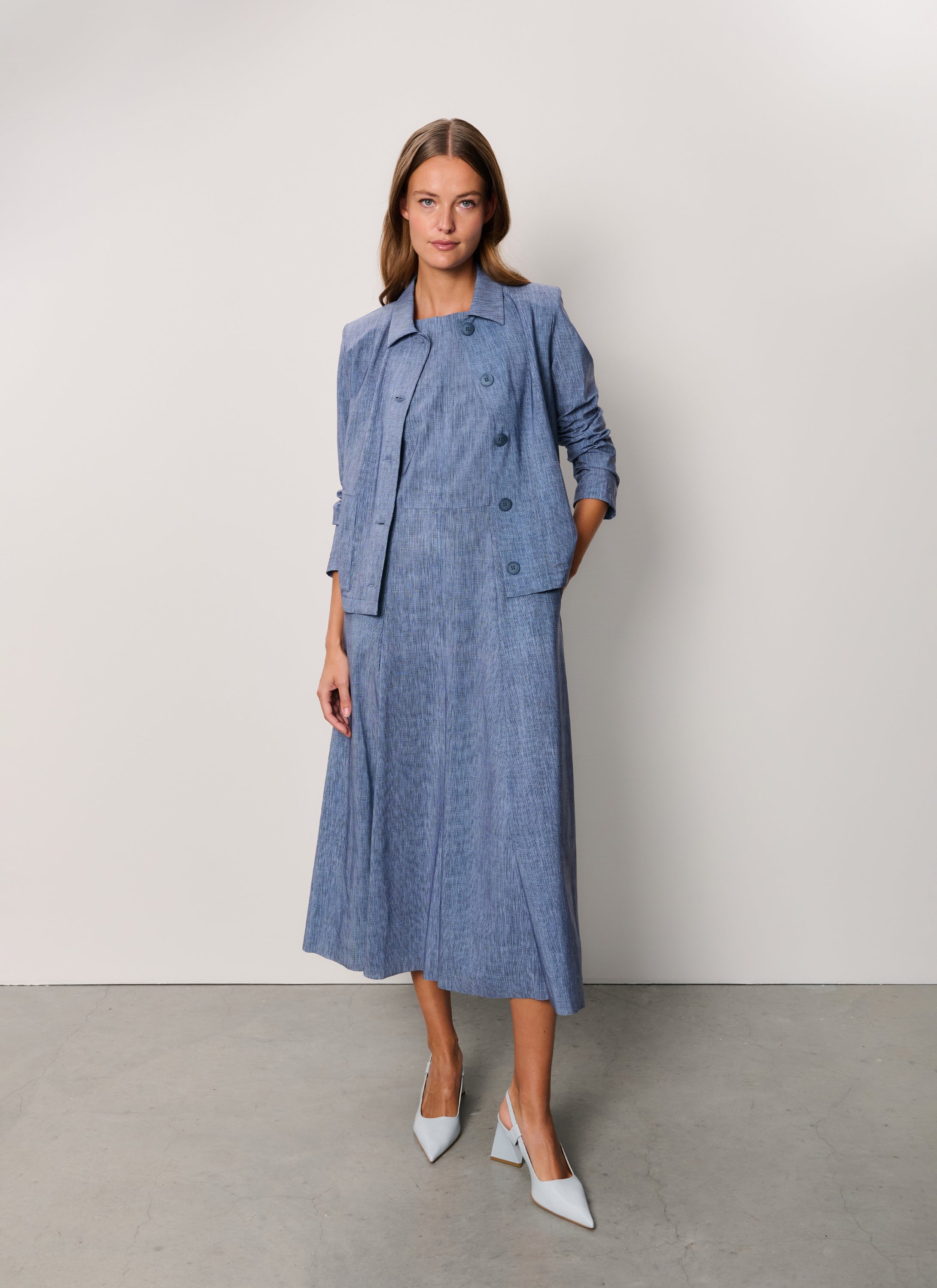 The Chisami print jacket is made from a regular travel jersey, offering both comfort and elegance. The blue-striped design is complemented by large buttons at the front for closure. With shoulder pads and a classic collar, this jacket adds a structured yet stylish touch to any outfit. Pair it effortlessly with the Tami print dress for a stylish look.