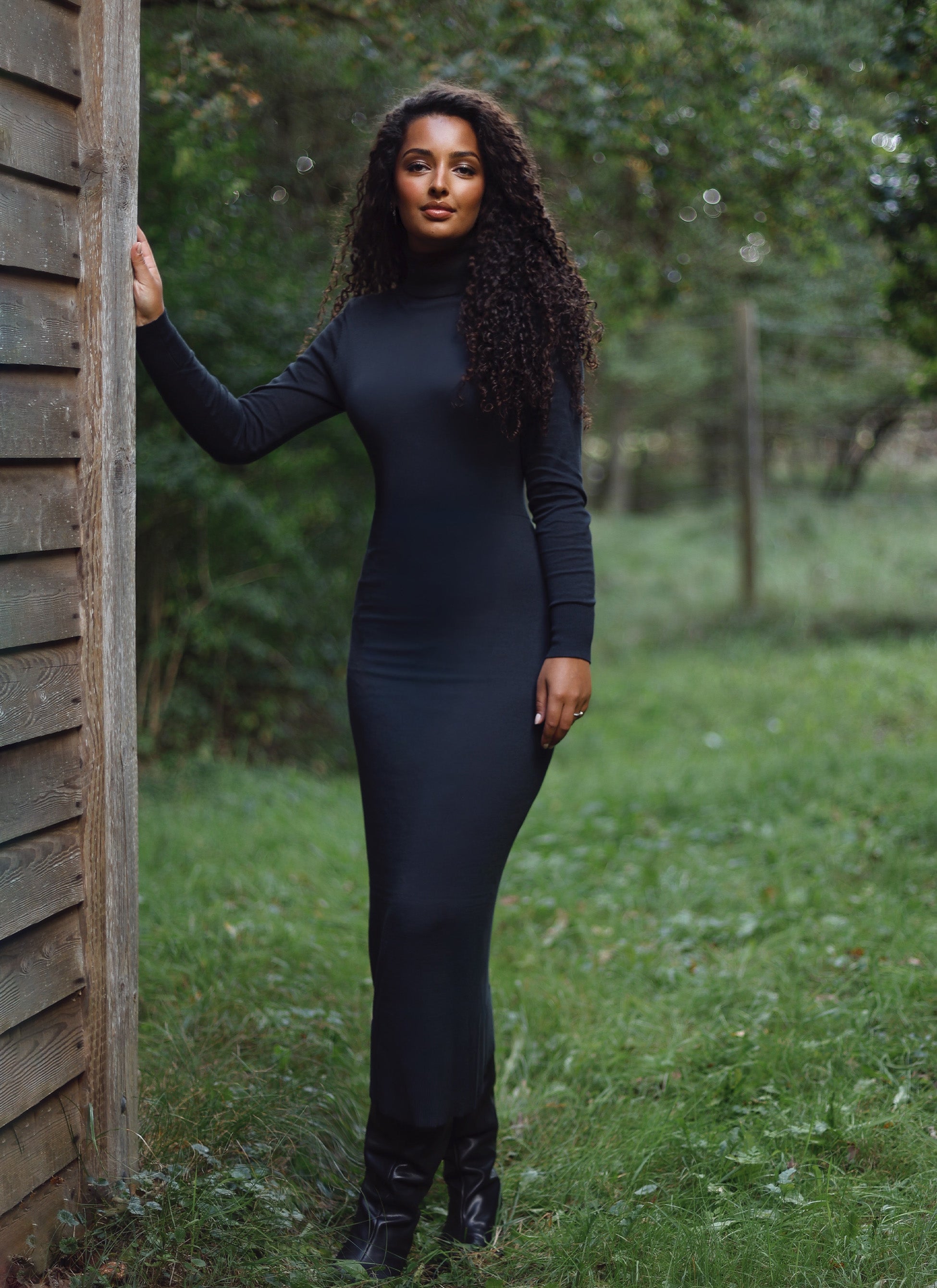 De Nagisa-jurk is een lange, elegante jurk van zachte katoenen knit. Met een stijlvolle col en een elastische taille accentueert ze subtiel de taille voor een vrouwelijke, flatterende pasvorm die soepel met je meebeweegt.