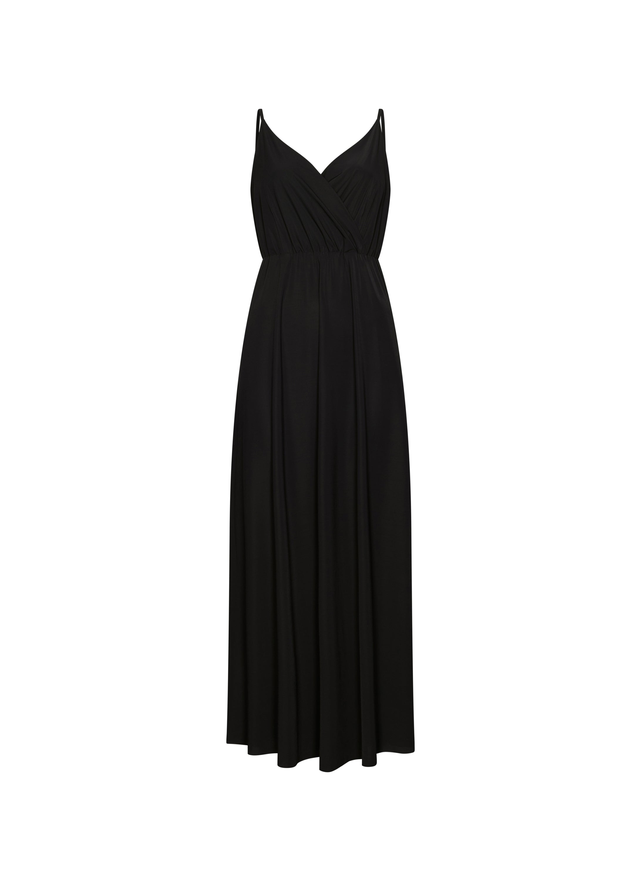 This elegant pink maxi dress exudes feminine charm and lightness. The design combines a flattering V-neckline with a pleated wrap-over top that subtly accentuates the décolleté. The thin spaghetti straps give the dress a refined, summery look. The elastic waistband ensures a comfortable fit while beautifully highlighting the silhouette. The skirt flows gracefully to the ankles, making it perfect for both casual and festive occasions.