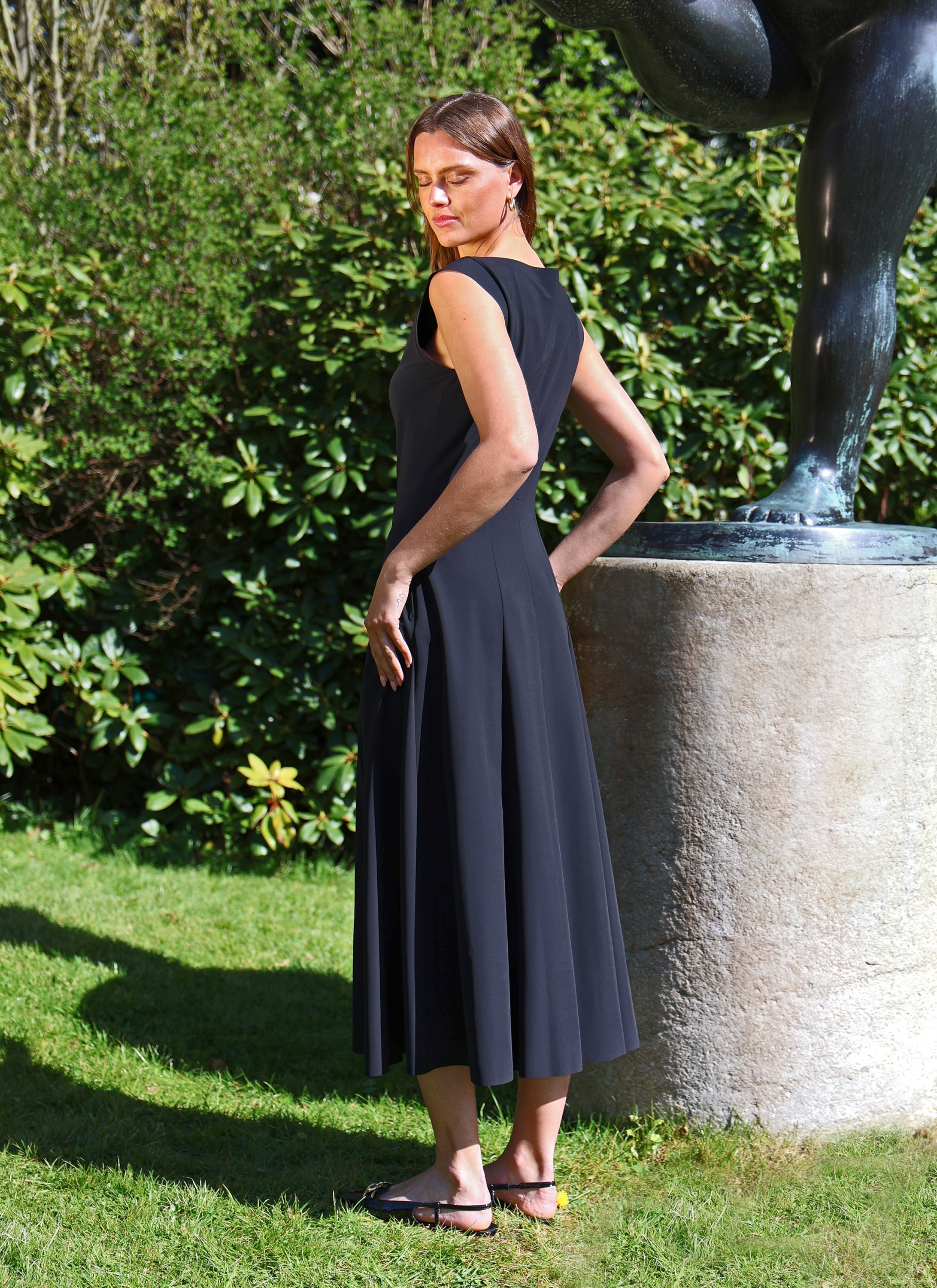The sleeveless Tami dress is a midi-length, elegant piece made from regular travel jersey in the shade deep black. Designed for both style and comfort, it features two front pockets for a subtle yet practical detail.