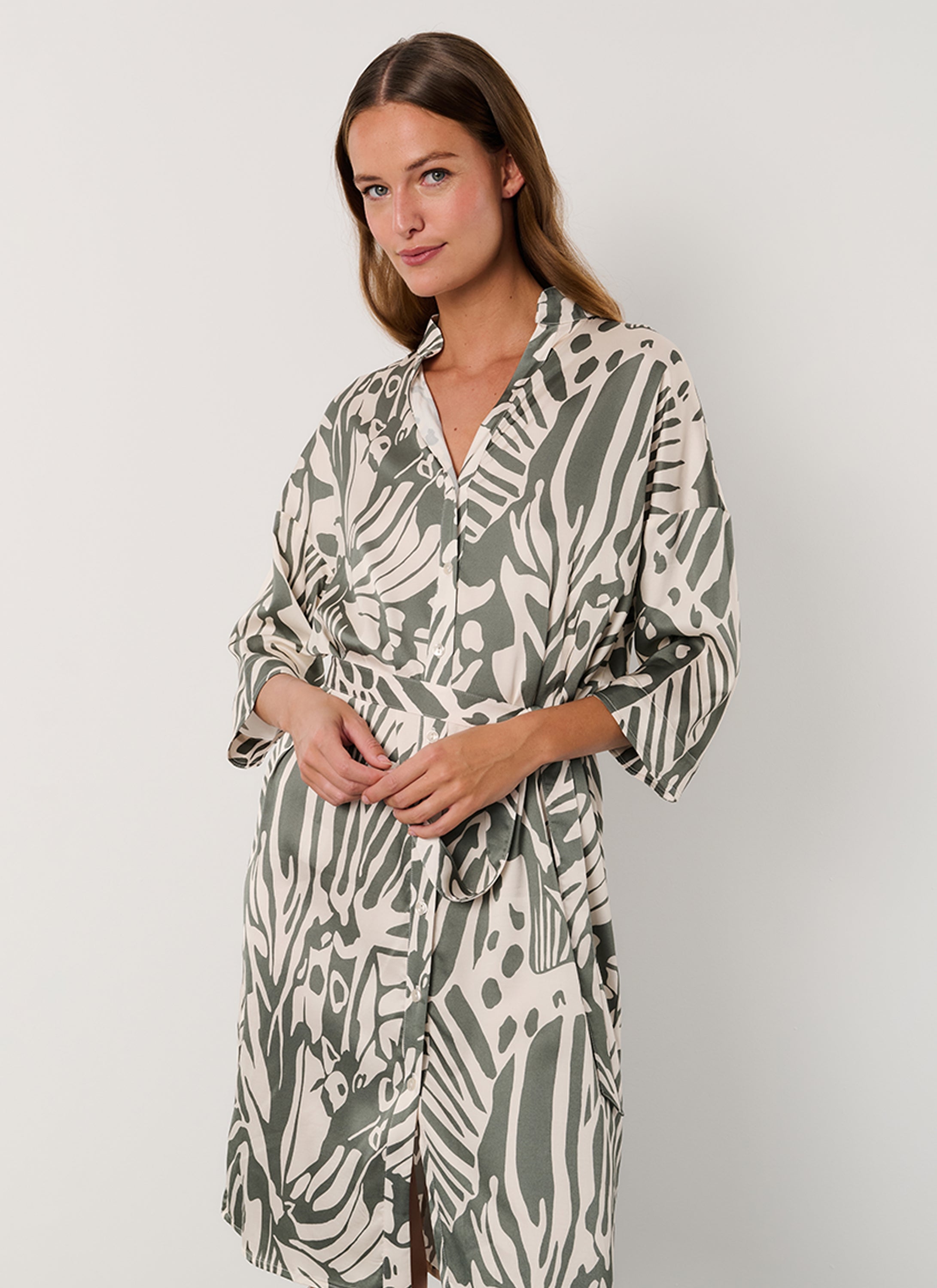 Embrace elegance with the Maro dress in Butterfly. Made from satin viscose dessin, this knee-length dress offers a luxurious sheen and silky-soft feel. Designed with a standing collar, button-down front, and a matching belt, it creates a refined silhouette that flatters every figure. The fluid fabric drapes beautifully, making it perfect for both daytime sophistication and evening glamour. Style it with heels for a polished look or flats for effortless chic.