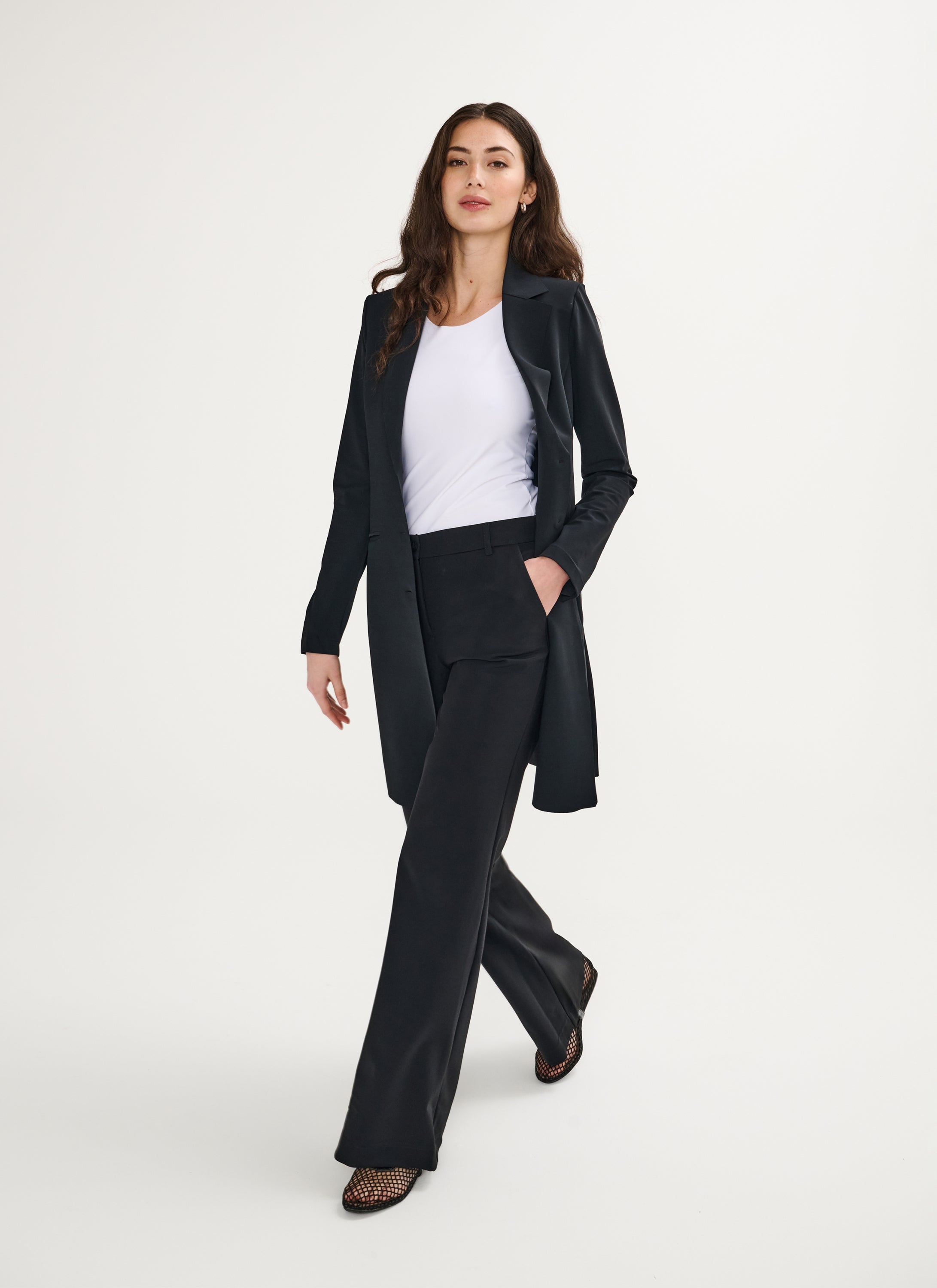 Discover our slightly flared pants in the elegant deep black, crafted from bonded travel, a thicker version of our beloved travel fabric. These black straight-leg pants offer a sleek, modern look and ultimate comfort. The wrinkle-free material molds perfectly to your body, ensuring you look effortlessly polished all day. Ideal for both work and leisure, these comfortable, wrinkle-free pants combine style and functionality. Shop now and explore our full collection of women’s pants for every occasion!