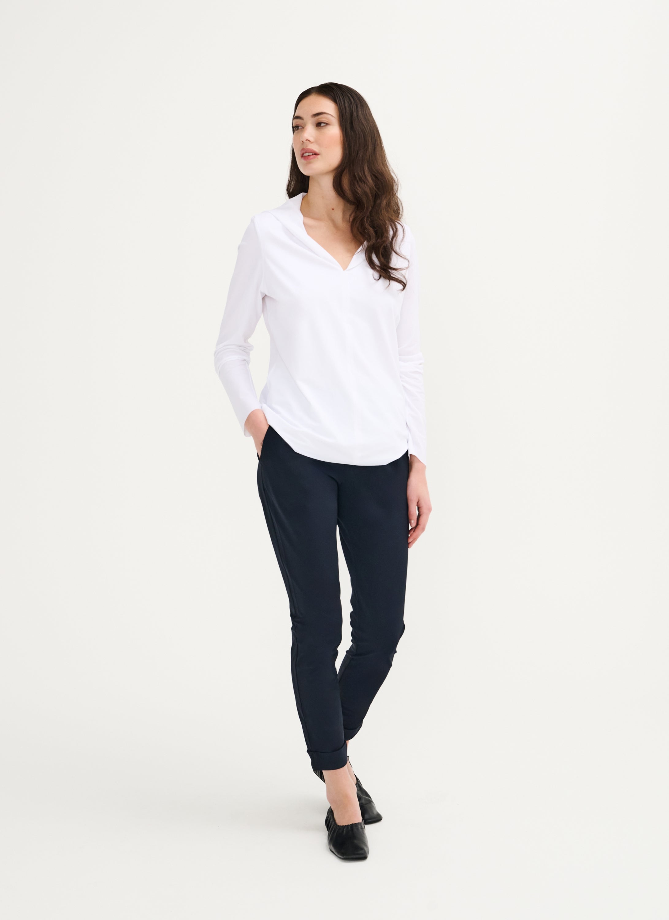 The Hanna pants are the perfect combination of style and comfort. Made from heavy travel quality in the beautiful black-blue color, these pants offer a luxurious look with a subtle sheen. The fabric feels smooth, hardly wrinkles, and is ideal for any occasion, whether you have a busy workday or a night out planned. With a slim fit, subtle pleat details, and rolled-up cuffs, the Hanna exudes a modern and elegant look. The elastic stretch fabric ensures optimal comfort and a perfect fit. Pair it with a blouse and heels for a chic look or wear it with sneakers for a casual touch.