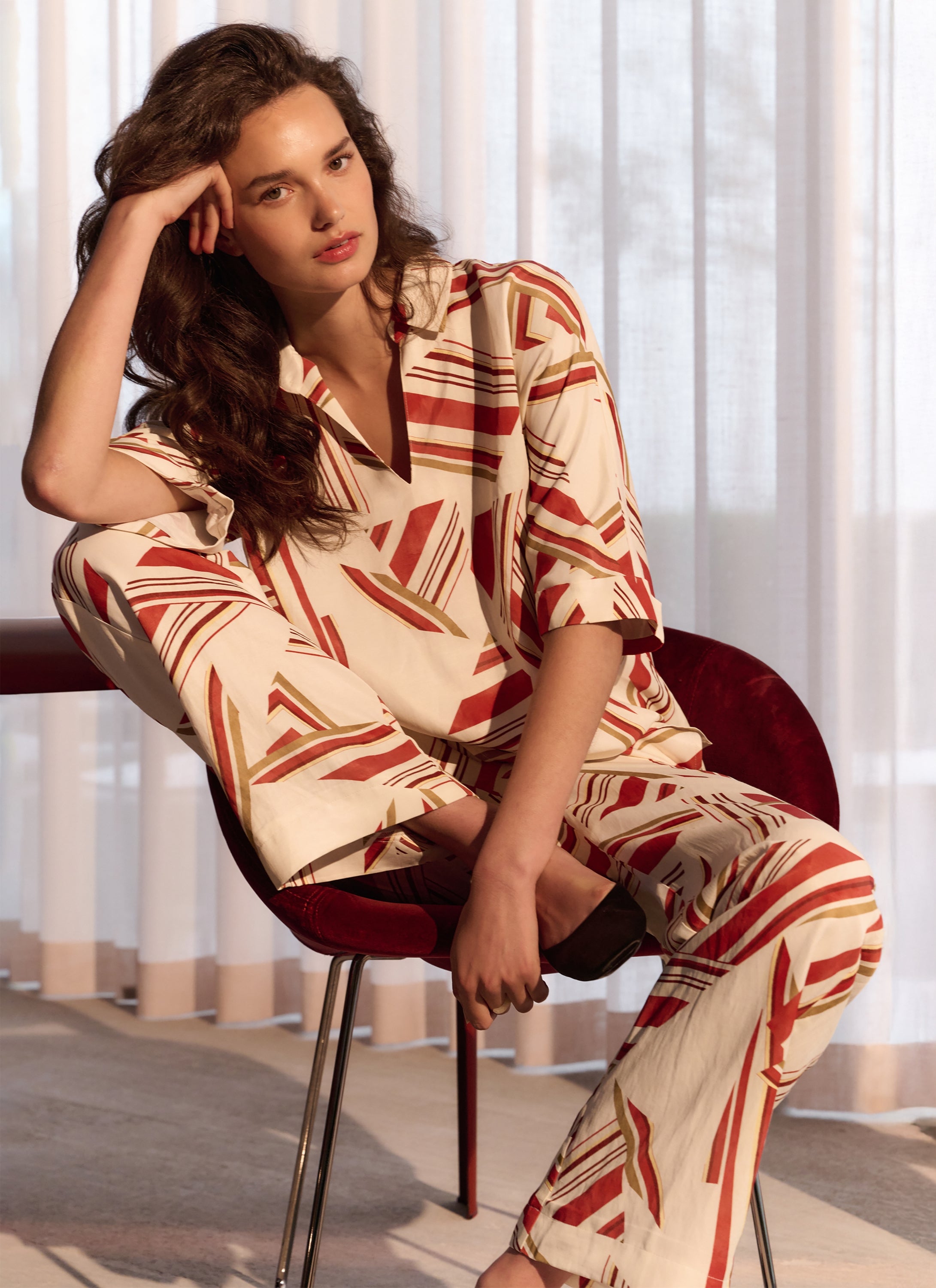 The Samadi pants from Japan TKY’s summer 2025 collection feature a chic straight-leg cut, offering a flattering and comfortable fit. Crafted from a luxurious viscose-linen blend, these pants showcase a stunning pink and gold striped print on an off-white background. Designed with practical side pockets and a button closure, they are both stylish and functional. Pair them with the Rui top for a complete, elegant look that's perfect for warm-weather occasions.