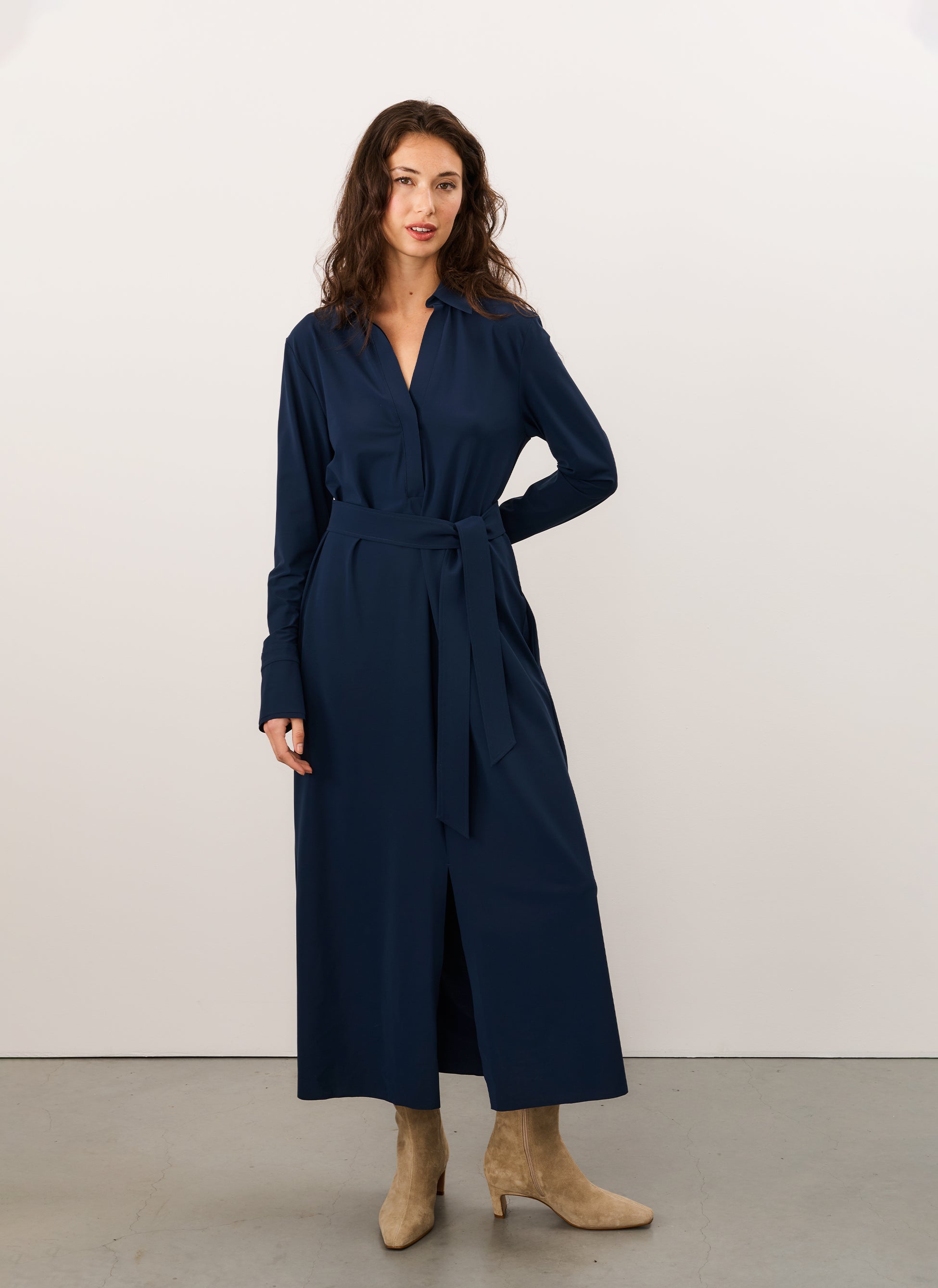 Rasy is a long dress that effortlessly blends style and comfort. Made from regular travel fabric for a smooth, easy-care look. The straight fit with matching belt creates a feminine silhouette – ideal for everyday wear or dressed-up occasions.