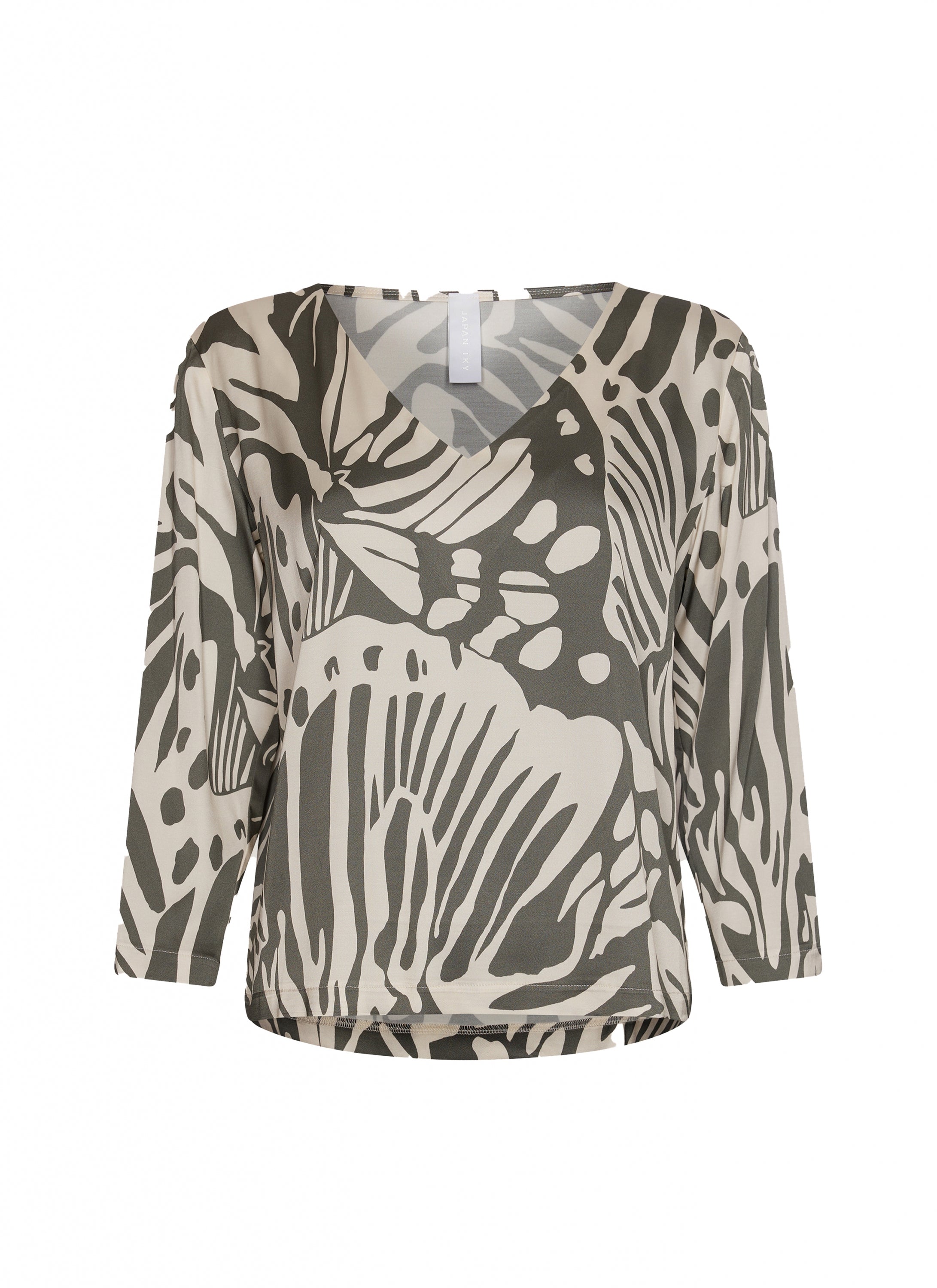 Elevate your wardrobe with the Rini blouse, a statement piece crafted from luxurious satin viscose dessin. Featuring the bold and elegant butterfly print, this lightweight blouse offers a silky-smooth feel with a sophisticated drape. The V-neckline and three-quarter sleeves create a timeless, flattering silhouette, perfect for both casual and chic occasions. Style it effortlessly with tailored trousers or denim for a polished yet relaxed look.