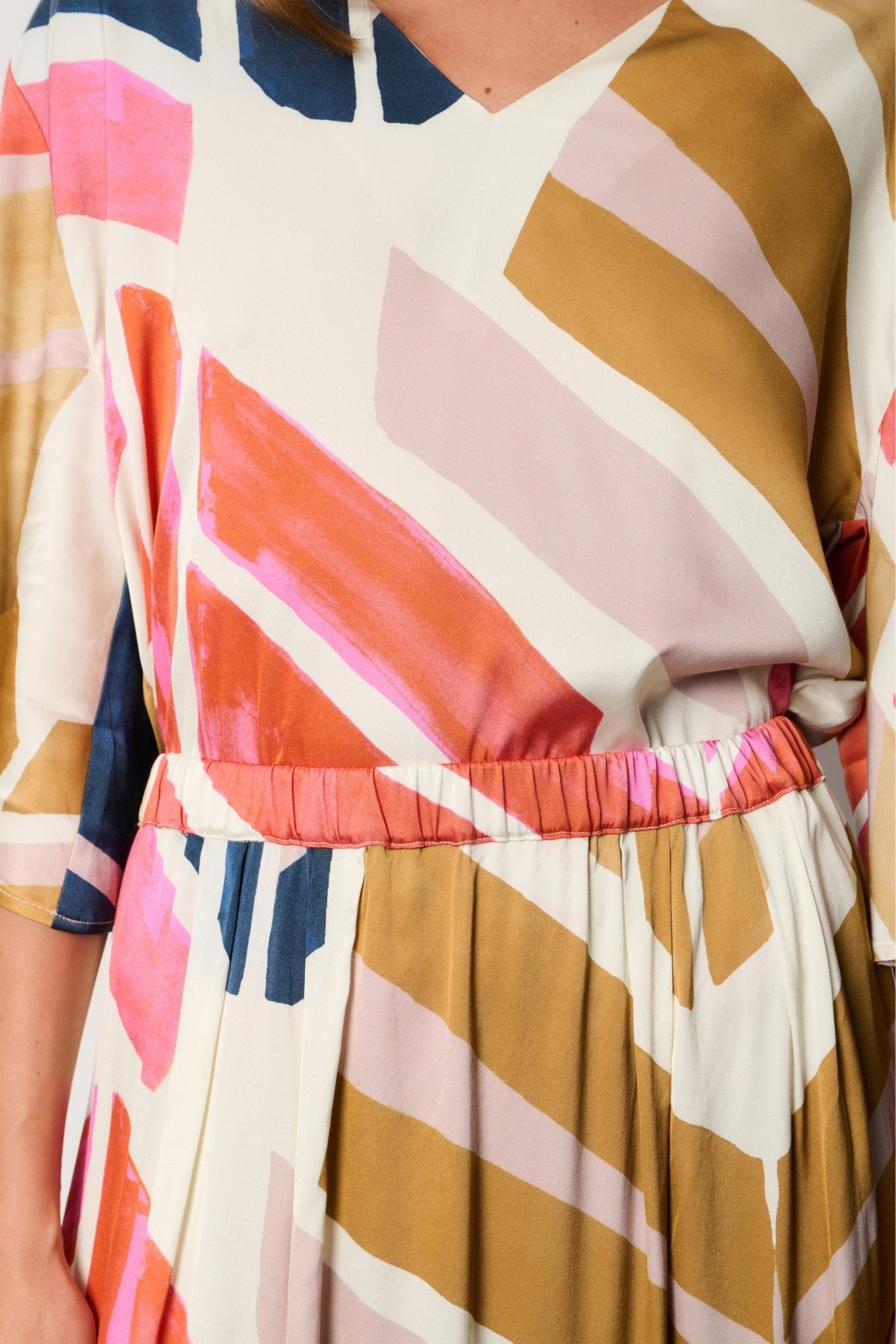 De Mitsuki rok is een midi geplooide rok van satijn viscose met een zachte, soepelvallende pasvorm. De rok heeft een elastische tailleband voor extra comfort en handige zijzakken in de naad voor extra functionaliteit. De luxe satijn viscose stof valt mooi en maakt de rok geschikt voor zowel casual als meer geklede gelegenheden. Combineer de Mitsuki rok met de Visay Dessin top voor een complete look met kleurrijke blokprints en een outfit die echt opvalt.