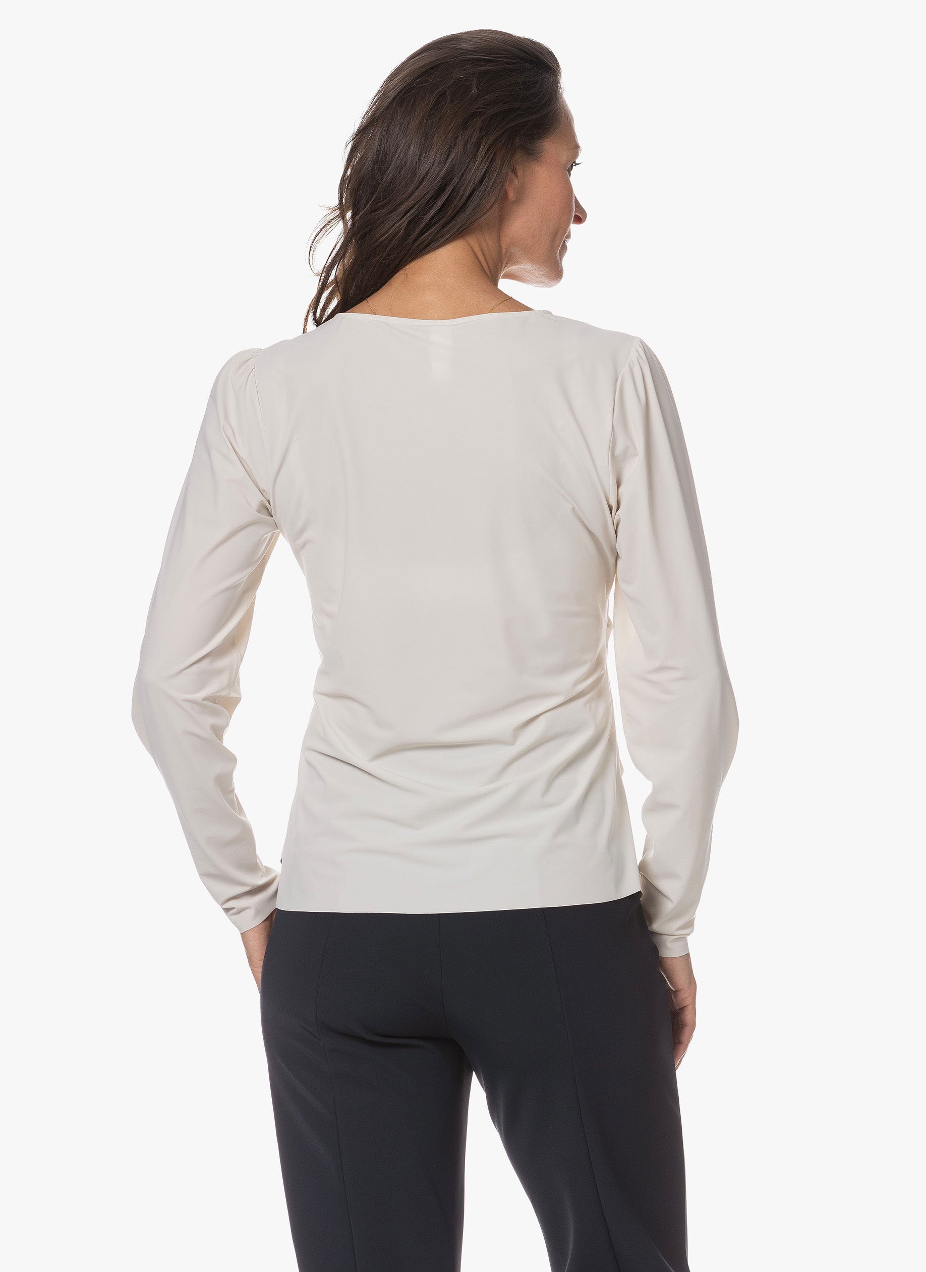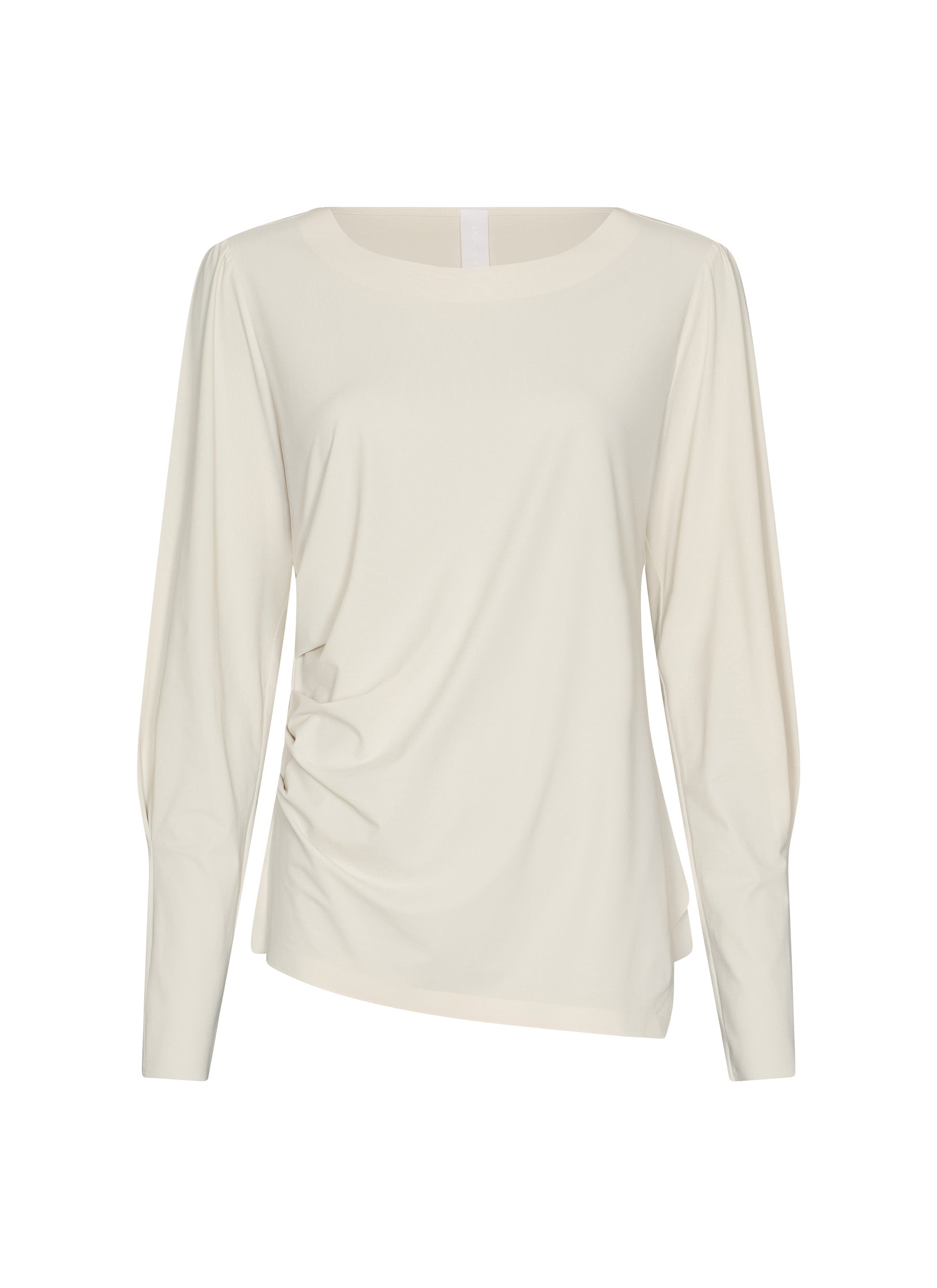 Niet zoals alle anderen, dat is top Futaba. De top met lange mouwen en ronde hals is uitgevoerd in light travel jersey, wat alle gedrapeerde details bij de schouders, taille en mouwen extra mooi laat uitkomen. Een ander detail wat extra aandacht verdiend, de asymmetrische zoom, die het geheel wat moderner laat aanvoelen.