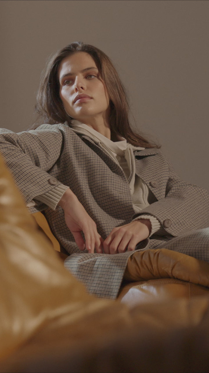 The first drop of F/W '25 combines café latte and navy tones with light and warm materials for a seamless transition into fall. Highlights in this collection include a striking blue satin suit, tops in soft lyocell, minimal check in cotton brushed in addition to travel jersey. In-between jackets and pants made of bonded travel jersey offer comfort in cooler weather, while longer cardigans, bombers and hooded blazers complete the look of this program. The drop is sporty paired with hooded knit cardigans, alpaca wool tops give this drop a warm touch for the chilly moments of fall.