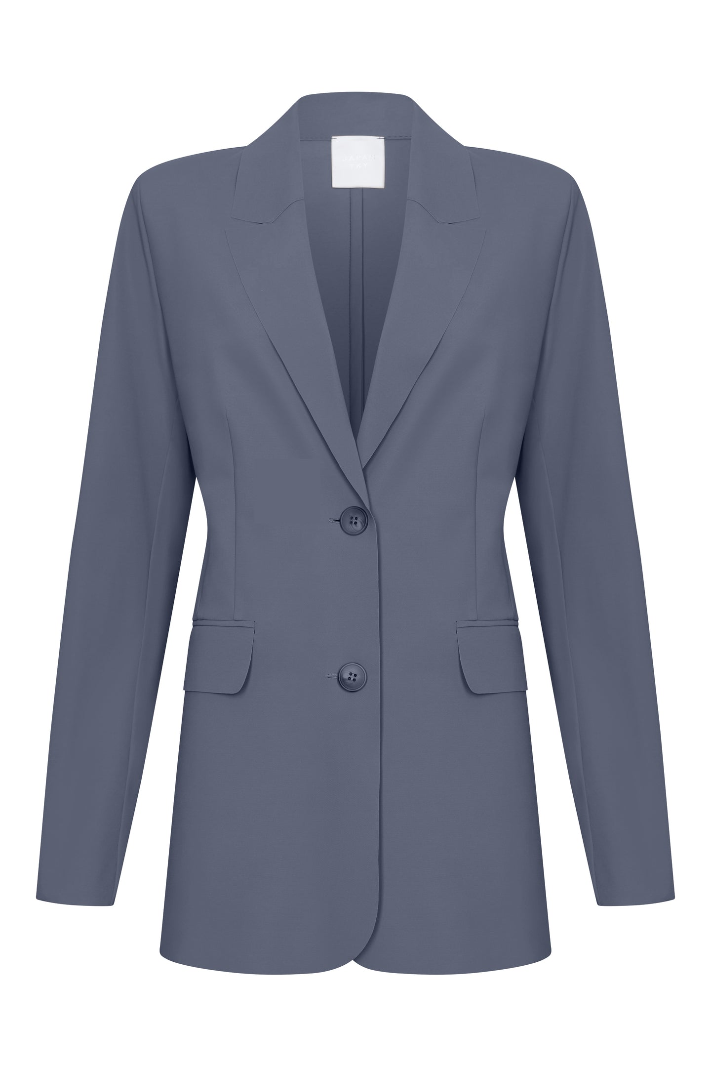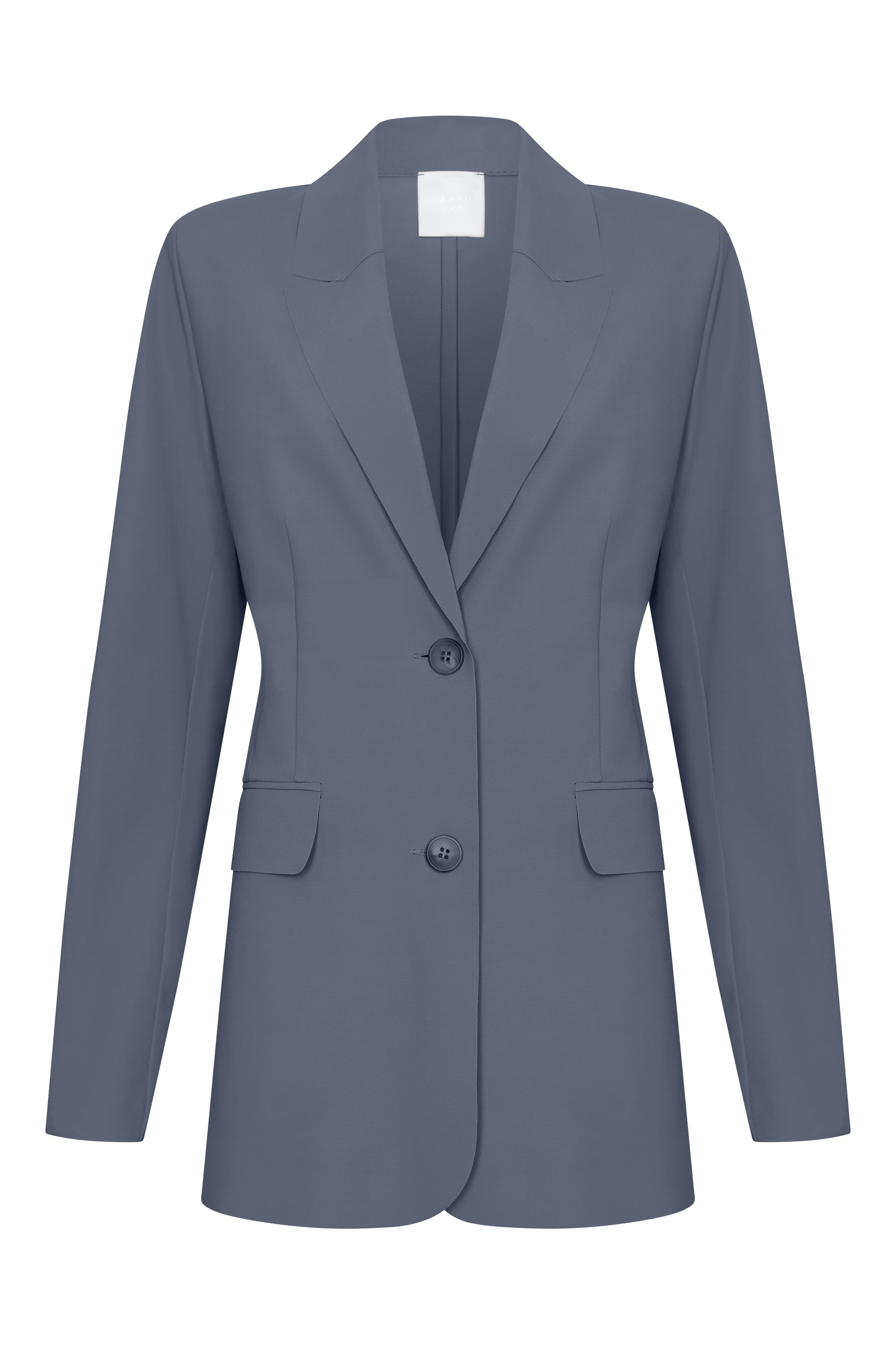 The oversized blazer in denim offers a modern twist on a classic design. With shoulder pads, a double-layered front, and made from easy-care, wrinkle-free travel jersey, this is a stylish and practical choice for everyday wear.