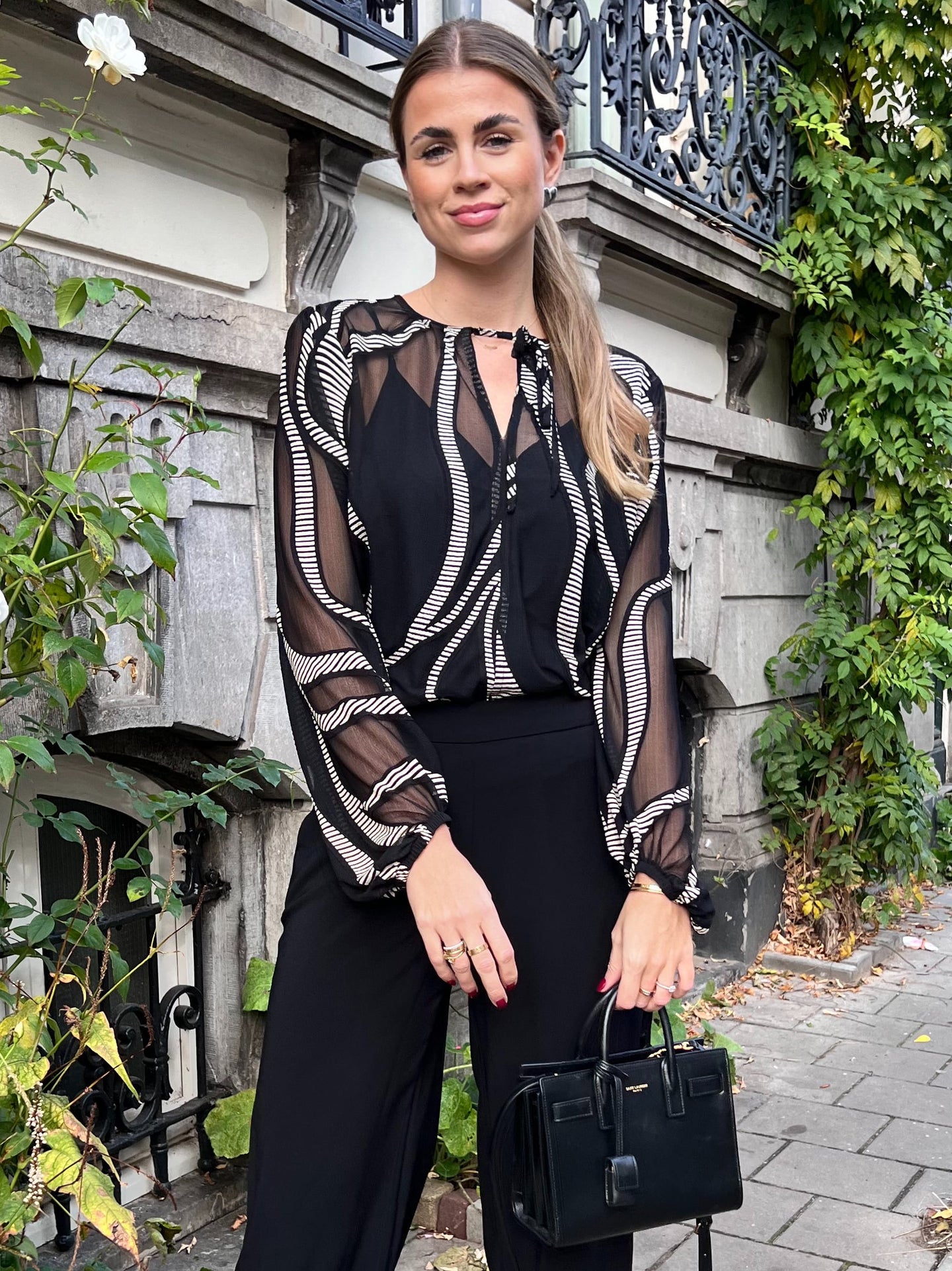 The Azora blouse, crafted from Ausbrenner fabric, offers a chic and modern look with its semi-sheer design. The alternating solid and transparent patterns add a refined yet bold touch. It balances femininity with sophistication, featuring a delicate tie at the neckline and slightly puffed sleeves.