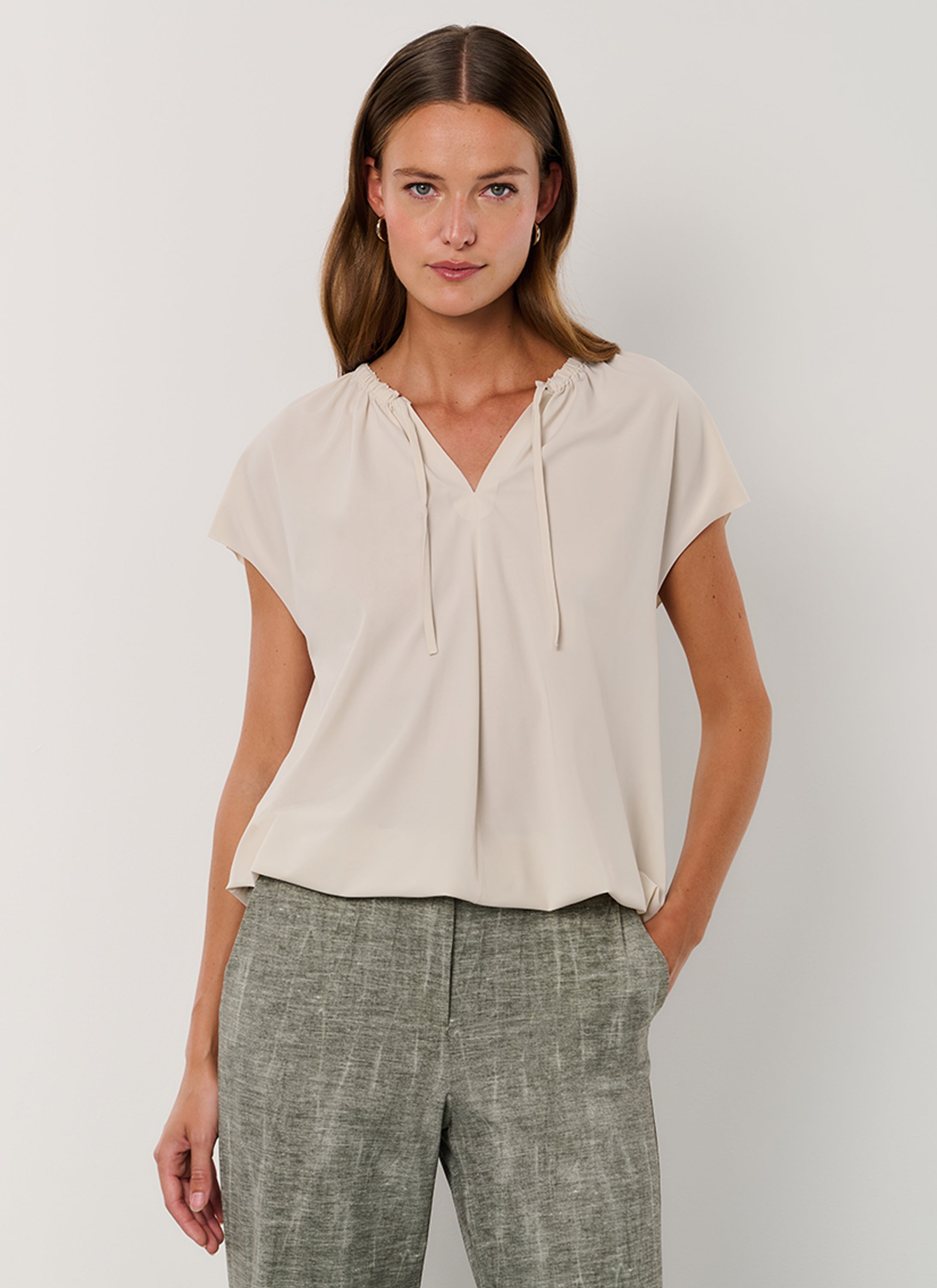 Discover effortless elegance with the Hiroko blouse in linen. Made from a light travel jersey, this blouse offers a soft, wrinkle-resistant fabric that ensures comfort and style all day long. Featuring a relaxed fit, cap sleeves, and a delicate gathered neckline with subtle tie details, it’s the perfect blend of sophistication and ease. Pair it with tailored trousers or a flowy skirt for a versatile, chic look.