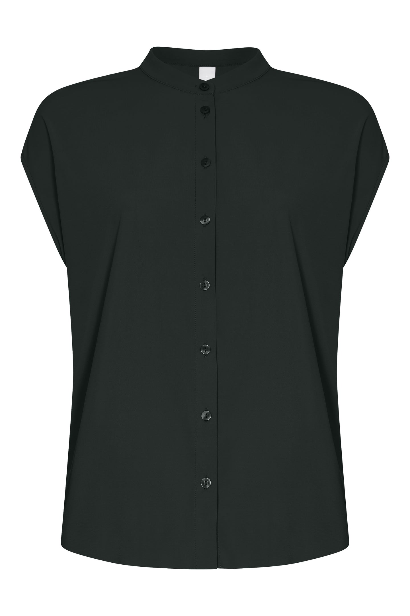 The Tokiko blouse in deep black is designed for comfort and style, making it a perfect choice for warm days. Made from light travel jersey, this fabric offers a breathable and airy fit while maintaining a polished look. With short sleeves and a standing collar, this blouse adds a modern touch to any outfit. Wear it with tailored pants for an effortless office look or pair it with casual trousers for a relaxed feel.