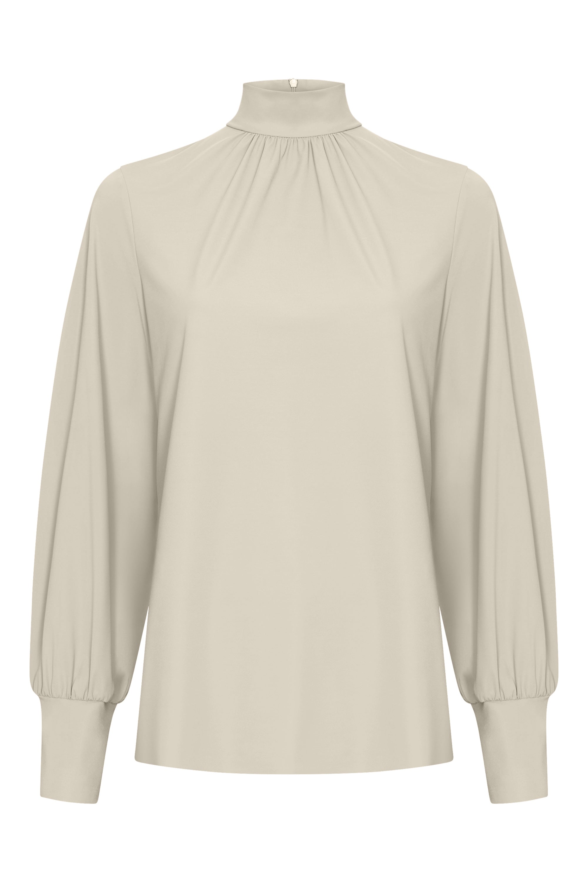 This blouse features a high neck with subtle gathering details that add a touch of elegance. It features a back zipper, making it easy to put on. The long sleeves are finished with fitted cuffs, enhancing the elegant look.