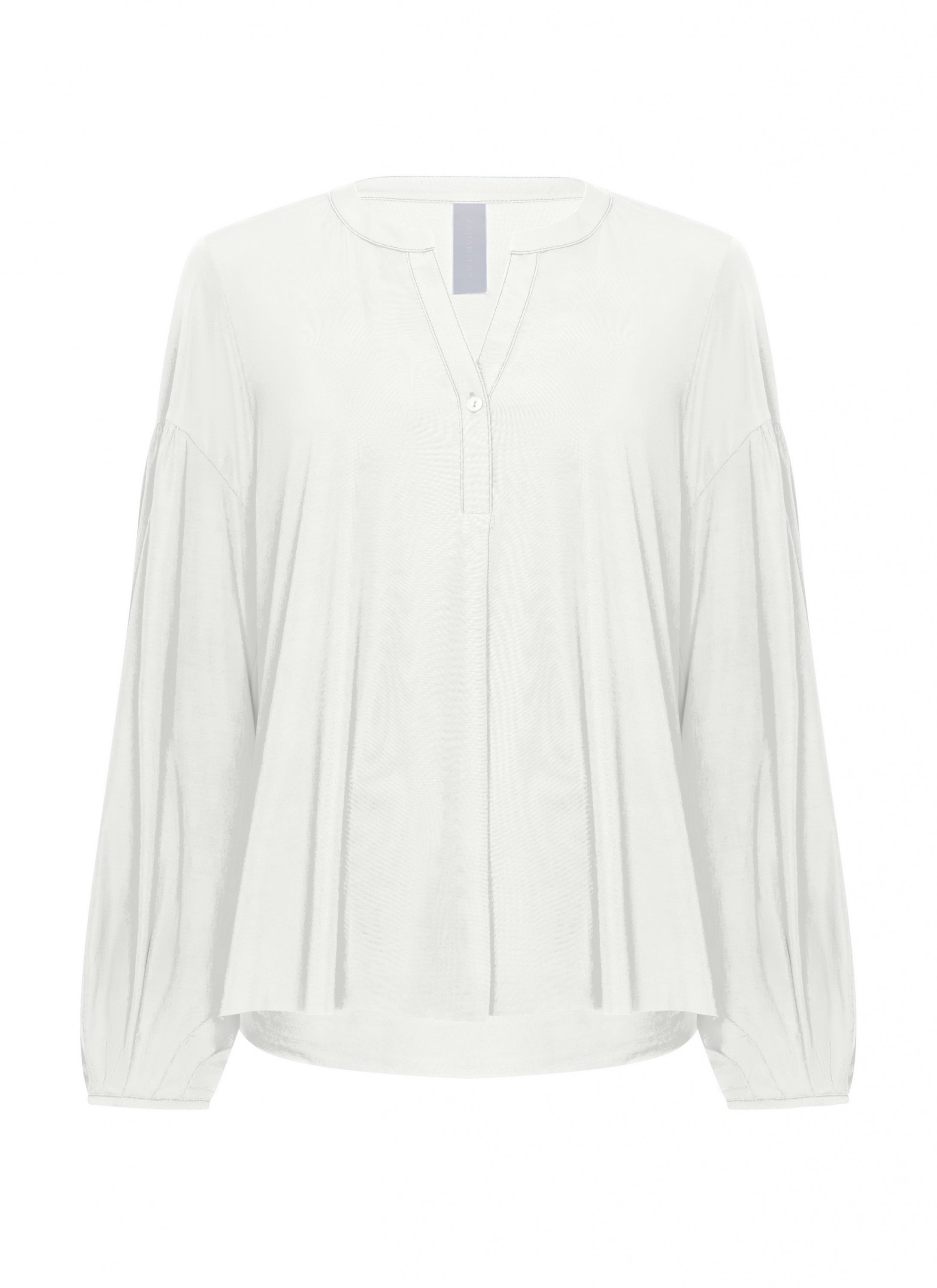 This blouse is crafted from Light Travel fabric and combines comfort with a refined look. The lightweight, fluid material is breathable, wrinkle free and comfortable to wear throughout the day. It features a loose fit with softly draped lines. The sleeves are finished with elastic cuffs, creating a subtle puffed effect that adds a feminine touch. The neckline is designed with a short button placket that does not extend all the way down, giving the blouse a modern and relaxed feel.