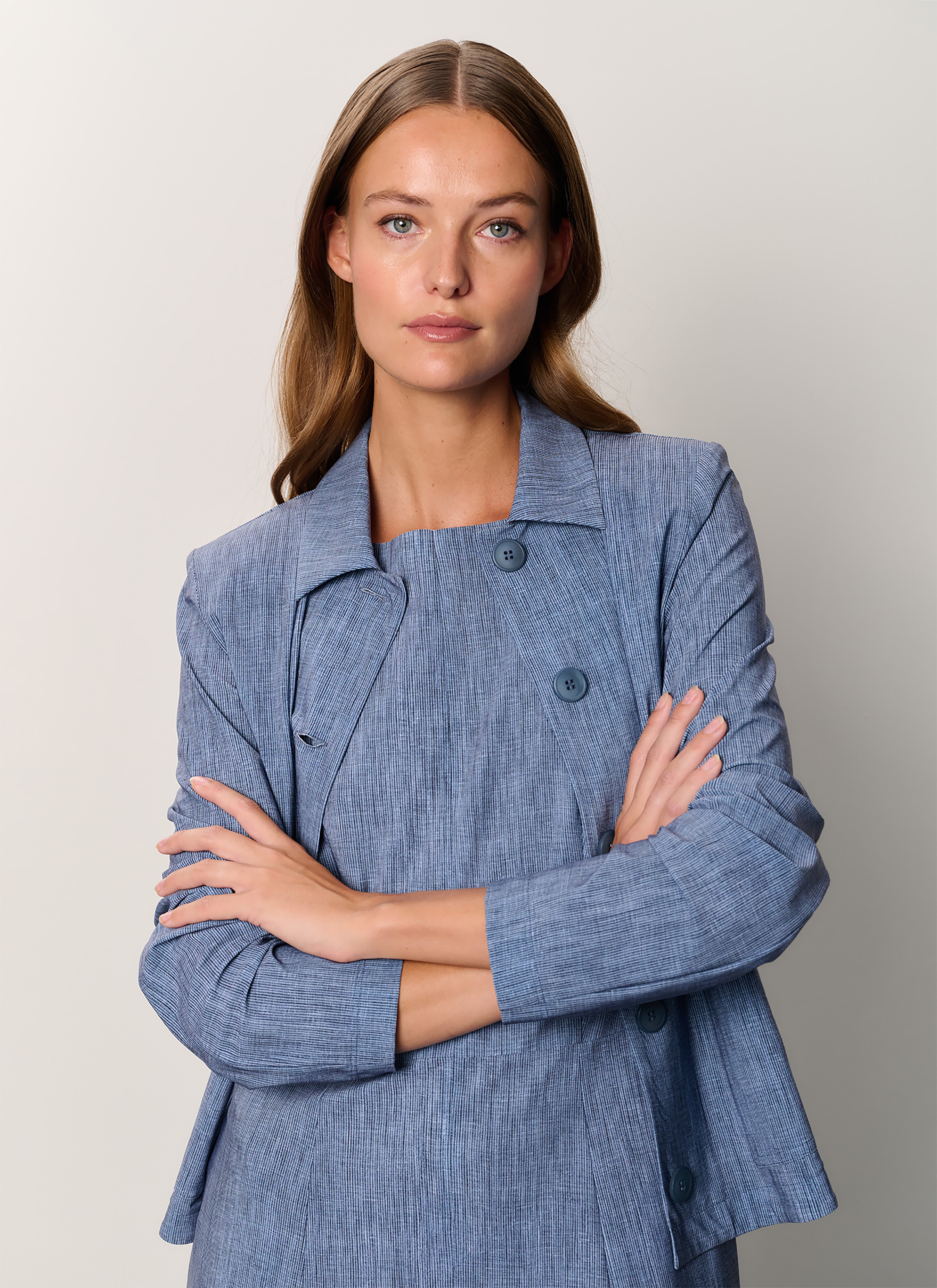 The Chisami print jacket is made from a regular travel jersey, offering both comfort and elegance. The blue-striped design is complemented by large buttons at the front for closure. With shoulder pads and a classic collar, this jacket adds a structured yet stylish touch to any outfit. Pair it effortlessly with the Tami print dress for a stylish look.