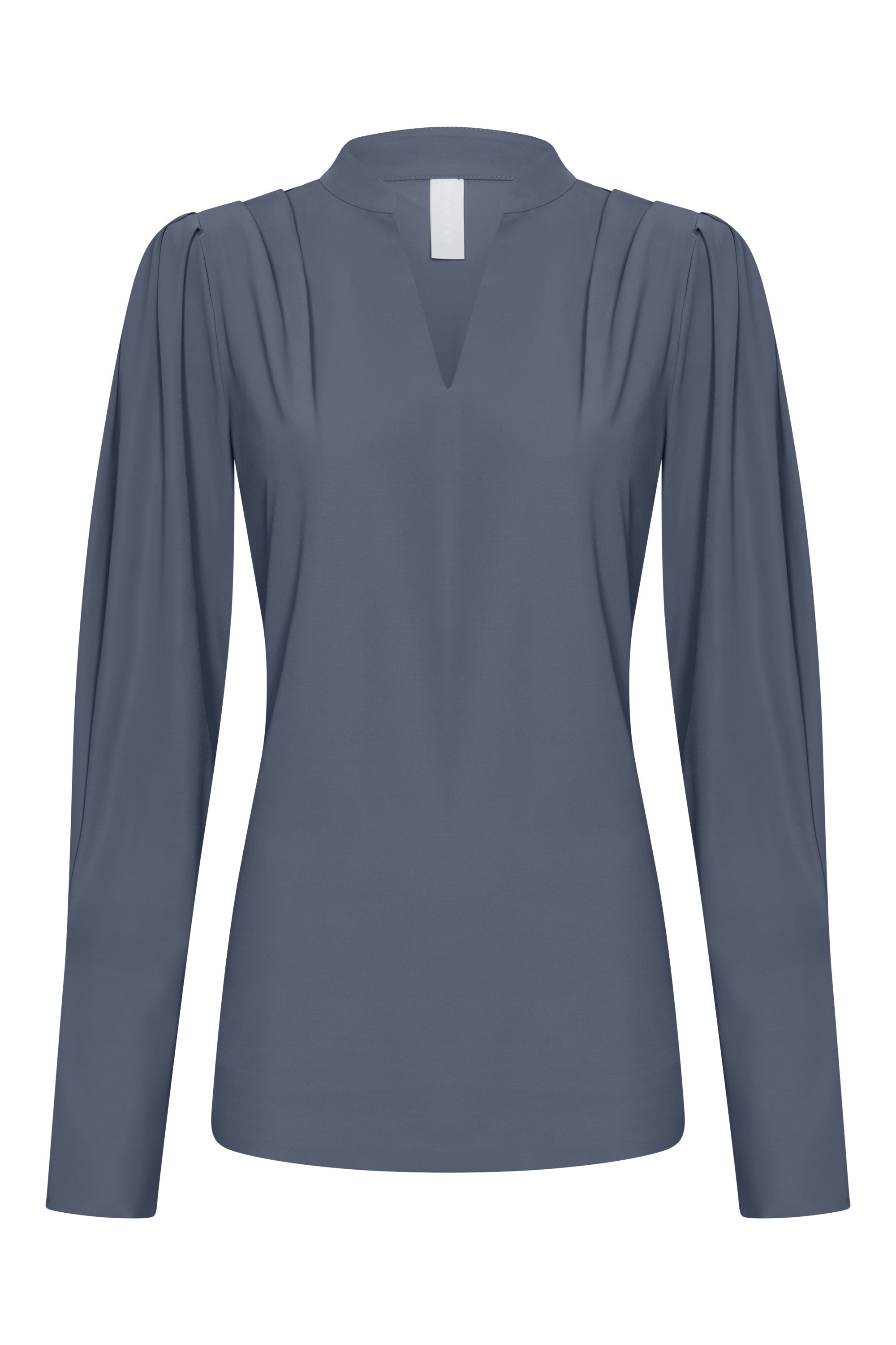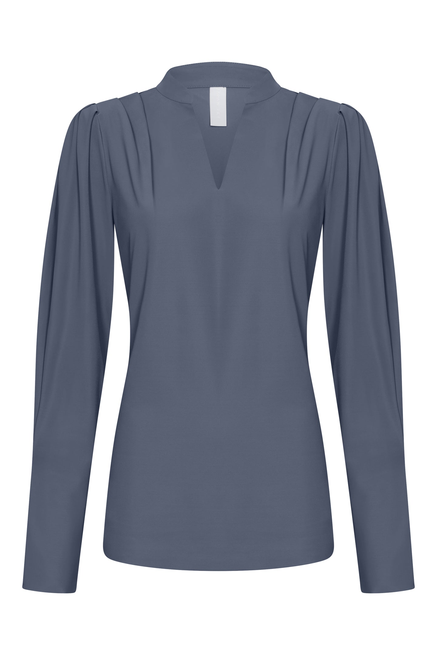 With a refined look, this blouse features a relaxed fit and an elegant V-neckline with subtle pleat details on the shoulders. The long sleeves end in a slight puff, adding a feminine and modern touch to the silhouette. The soft, wrinkle-free fabric is perfect for formal and casual occasions, ensuring daily comfort.