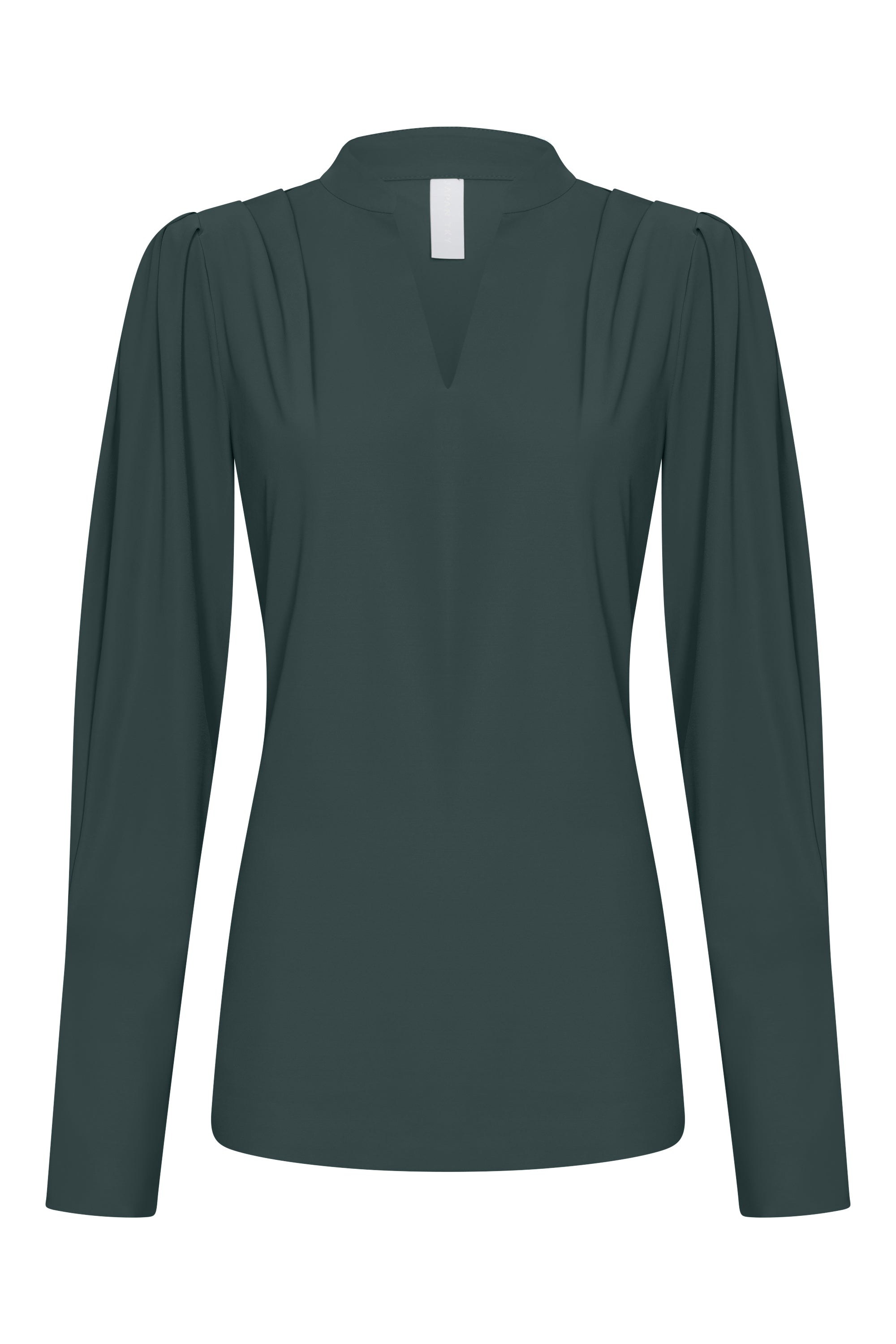 With a refined look, this blouse features a relaxed fit and an elegant V-neckline with subtle pleat details on the shoulders. The long sleeves end in a slight puff, adding a feminine and modern touch to the silhouette. The soft, wrinkle-free fabric is perfect for formal and casual occasions, ensuring daily comfort.
