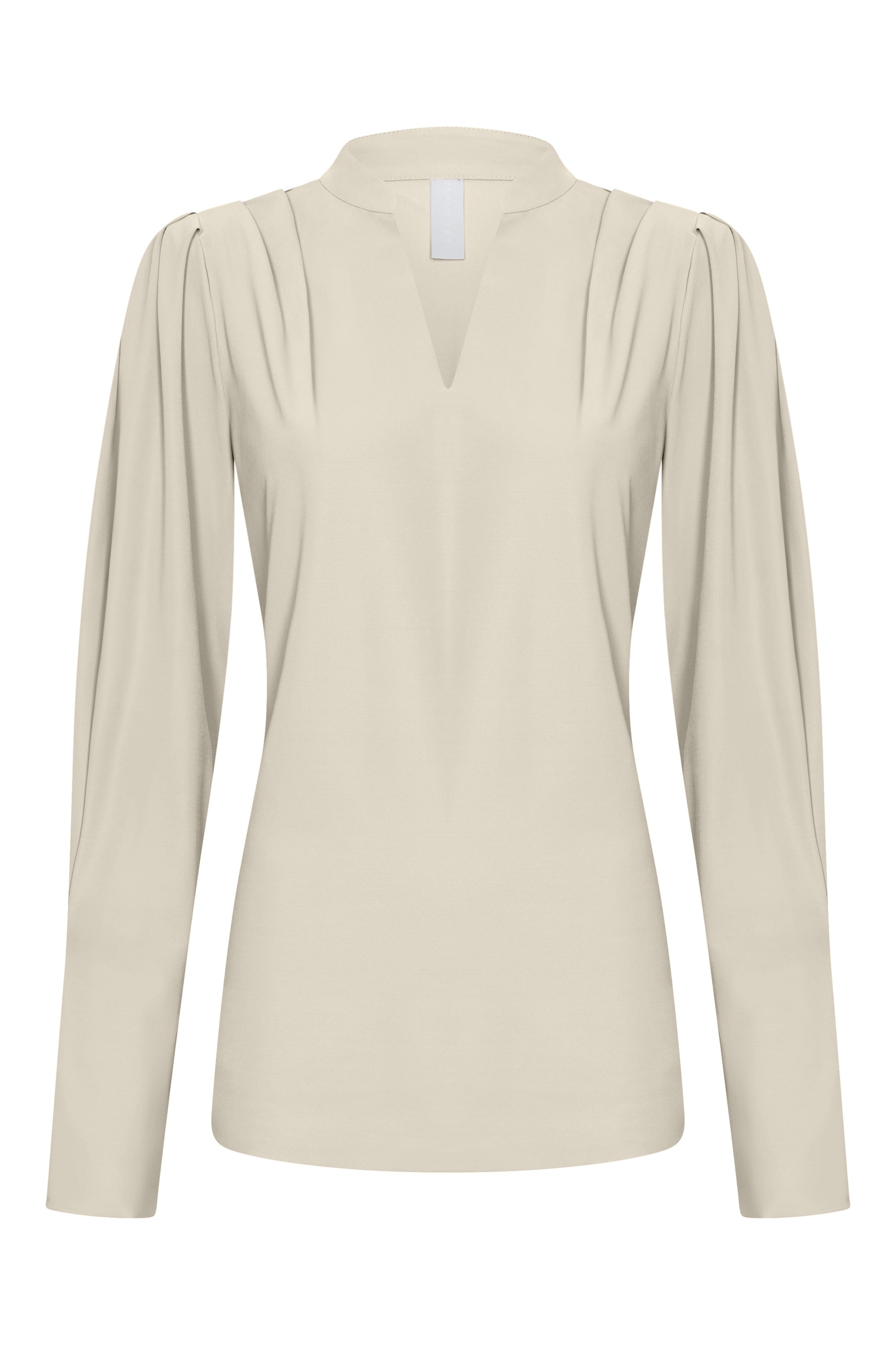 With a refined look, this blouse features a relaxed fit and an elegant V-neckline with subtle pleat details on the shoulders. The long sleeves end in a slight puff, adding a feminine and modern touch to the silhouette. The soft, wrinkle-free fabric is perfect for formal and casual occasions, ensuring daily comfort.