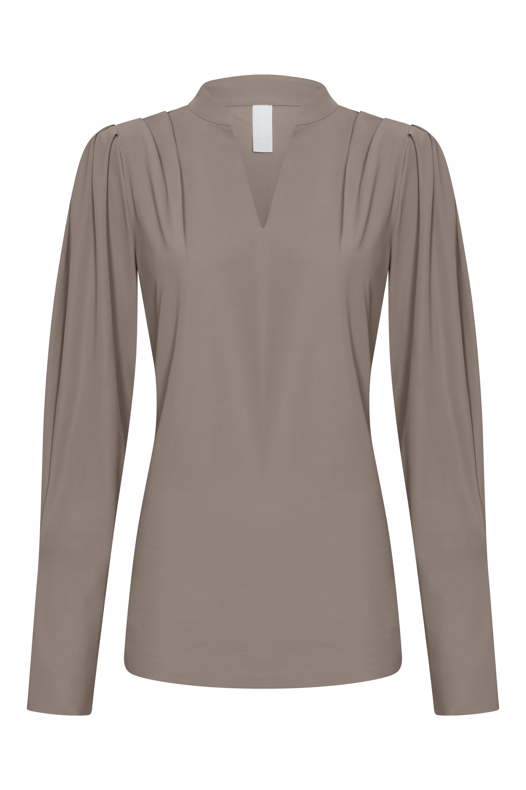 With a refined look, this blouse features a relaxed fit and an elegant V-neckline with subtle pleat details on the shoulders. The long sleeves end in a slight puff, adding a feminine and modern touch to the silhouette. The soft, wrinkle-free fabric is perfect for formal and casual occasions, ensuring daily comfort.