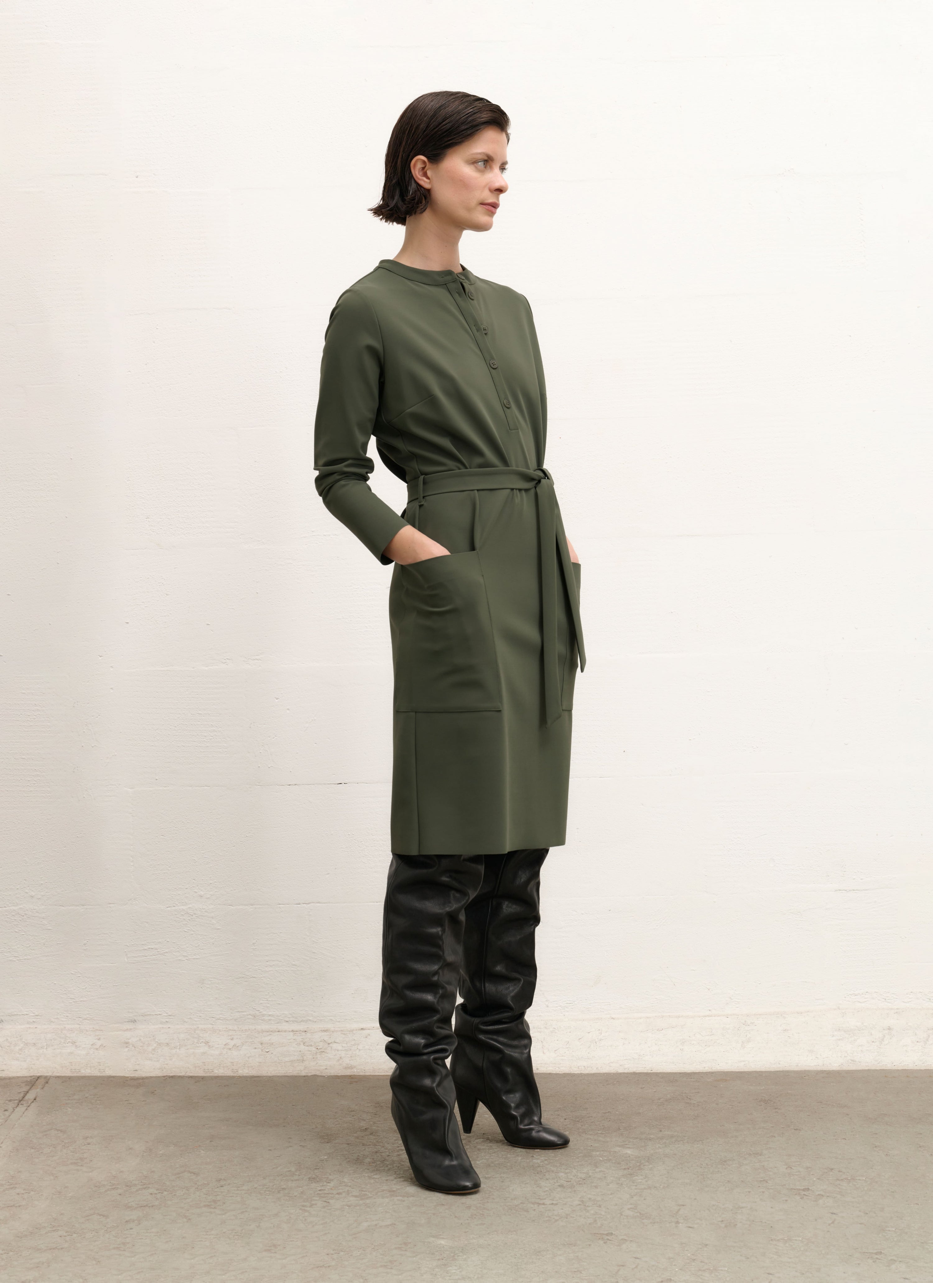 The Maki dress is an elegant and versatile piece designed for comfort and style. It's made from bonded travel fabric ensuring a wrinkle-free and polished look throughout the day. The dress includes a matching belt to accentuate the silhouette.