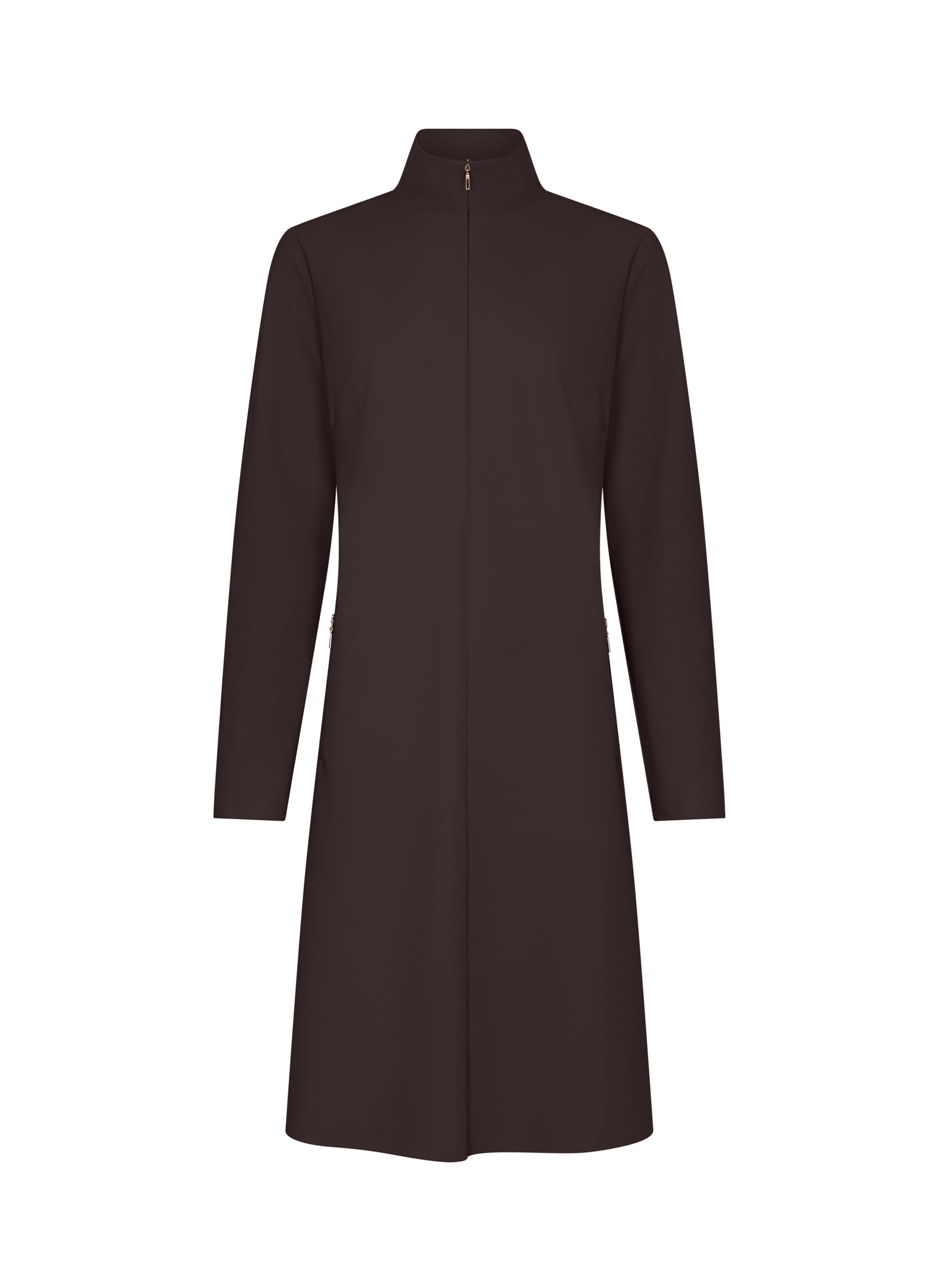 The Tamo dress combines modern elegance with functionality. Made from a thick heavy travel fabric, it features a stand-up collar with a half-zip closure for a contemporary twist. Two front zip pockets add a practical touch, making it a versatile piece for any occasion.
