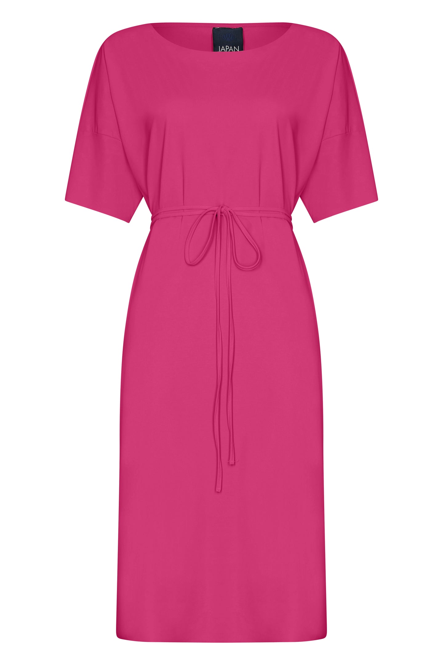 This vibrant bright pink dress, crafted from Japan TKY’s signature travel jersey, offers a relaxed fit with a flattering half-length design and elegant three-quarter sleeves. The adjustable waist belt allows you to tailor the silhouette to your liking. Made from wrinkle-resistant fabric, it’s perfect for travel and everyday wear, seamlessly combining comfort and style. Thanks to its easy-care, low-maintenance design, this dress is the ideal choice for the modern woman on the go. Pair it with white boots for a chic, polished look.