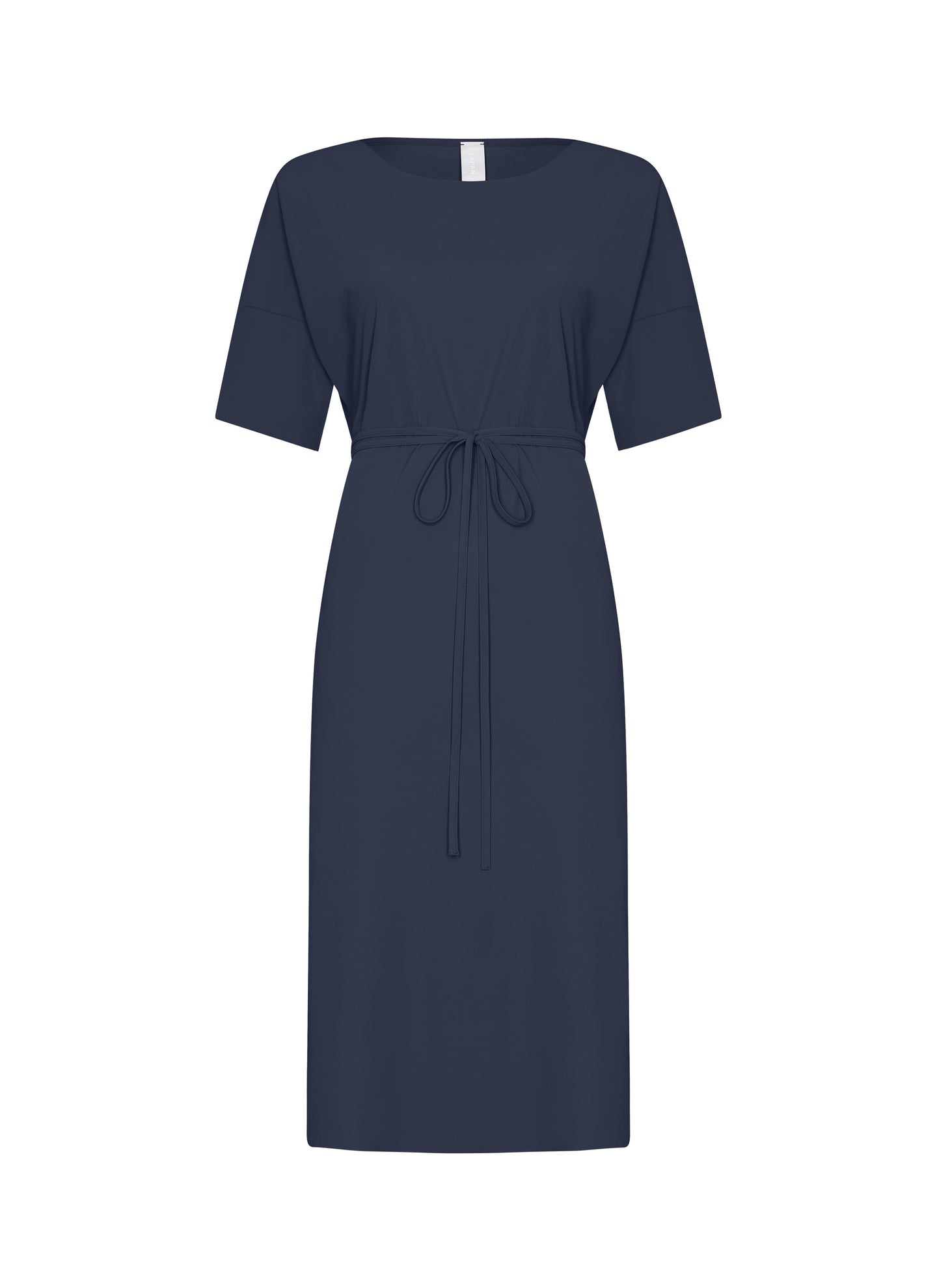 This timeless dress, crafted from Japan TKY’s signature travel jersey, offers a relaxed fit with a flattering half-length design and elegant three-quarter sleeves. The adjustable waist belt allows you to tailor the silhouette to your liking. Made from wrinkle-resistant fabric, it’s perfect for travel and everyday wear, seamlessly combining comfort and style. Thanks to its easy-care, low-maintenance design, this dress is the ideal choice for the modern woman on the go. Pair it with white boots for a chic, polished look.