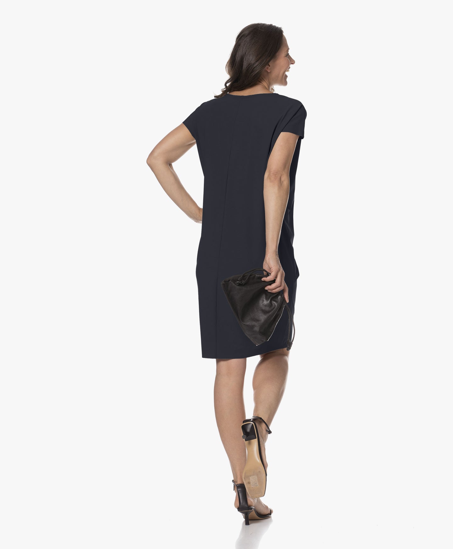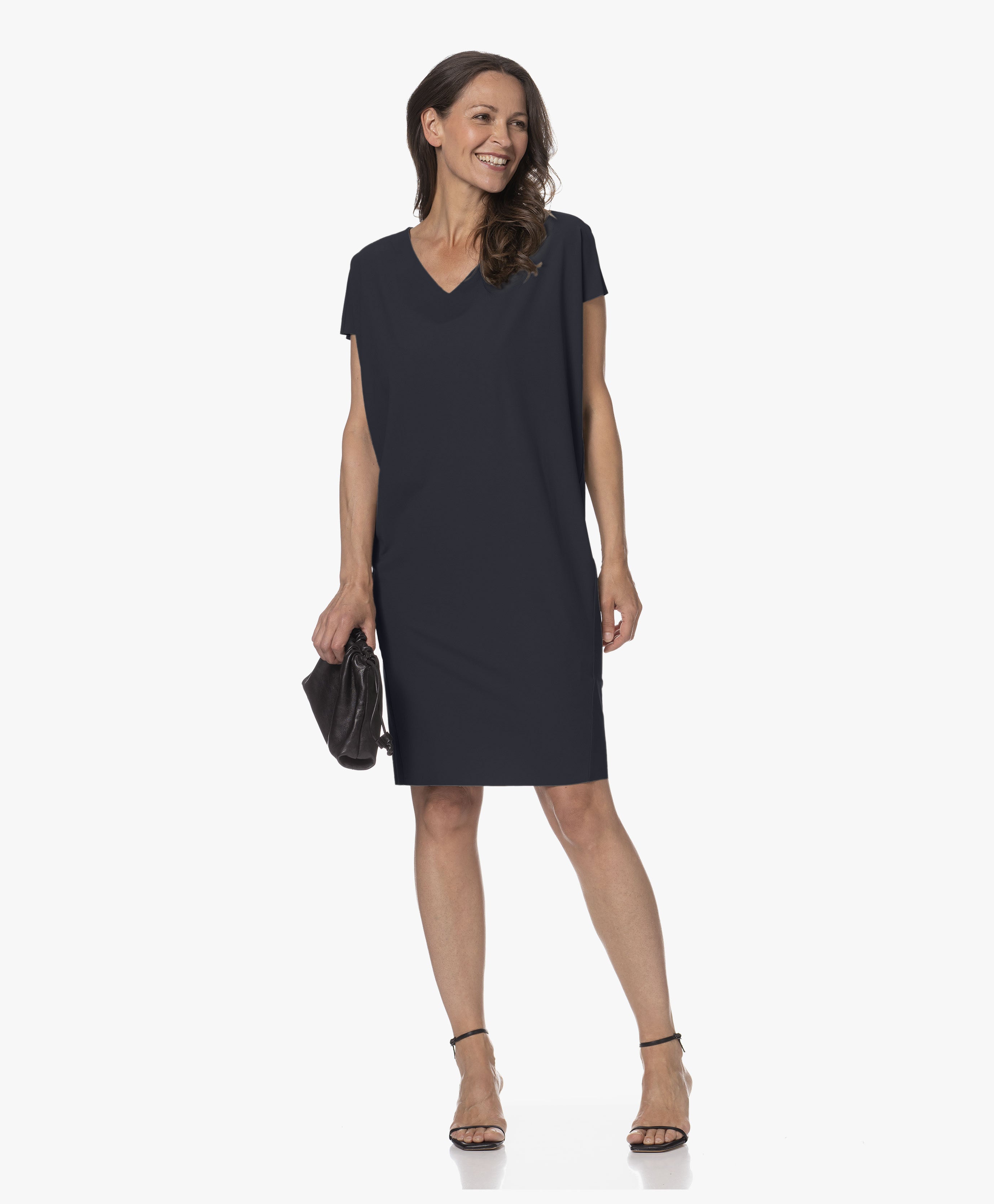 The Misas dress combines comfort and refinement. It is made from smooth and stretchy regular travel jersey. The straight silhouette, midi length, and clean detailing make it versatile for workdays and weekends.
