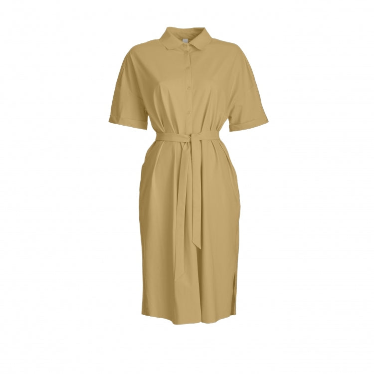 Discover the ultimate fusion of comfort and style with this versatile short-sleeve belted dress in safari sand, crafted from our signature regular travel jersey fabric. Lightweight and wrinkle-resistant, this dress is ideal for effortless elegance, whether you're at the office or traveling. The tailored design features a classic button-up front and a detachable belt to enhance your silhouette. Its breathable and low-maintenance fabric ensures that you stay comfortable throughout the day. Pair it with sneakers for a casual look or elevate it with heels for a more polished style.