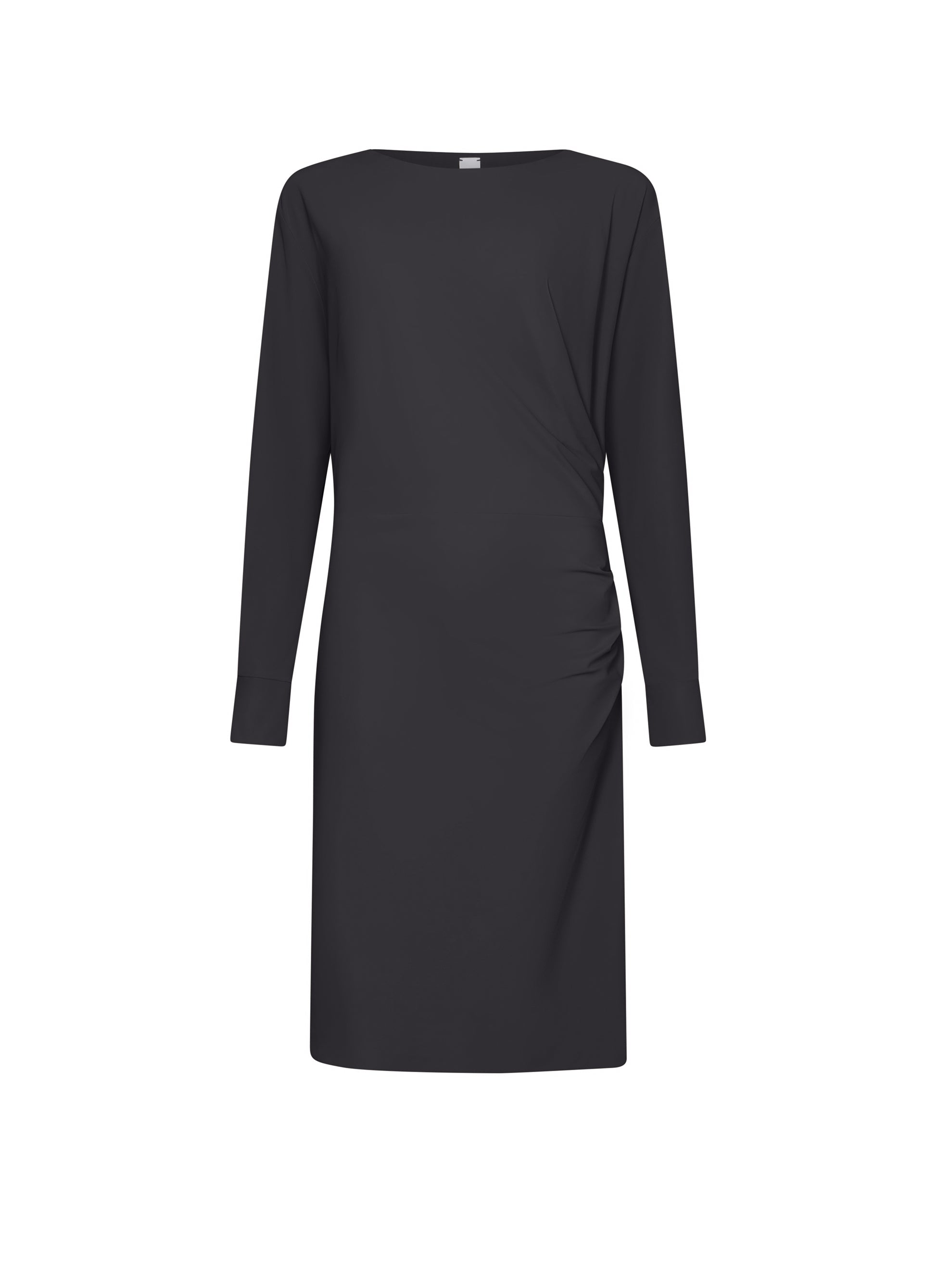 The Shizuo dress is designed to make an impression. Made from fluid travel jersey, it beautifully highlights the draped detailing. Long sleeves, a boat neckline, and knee length complete the elegant look.