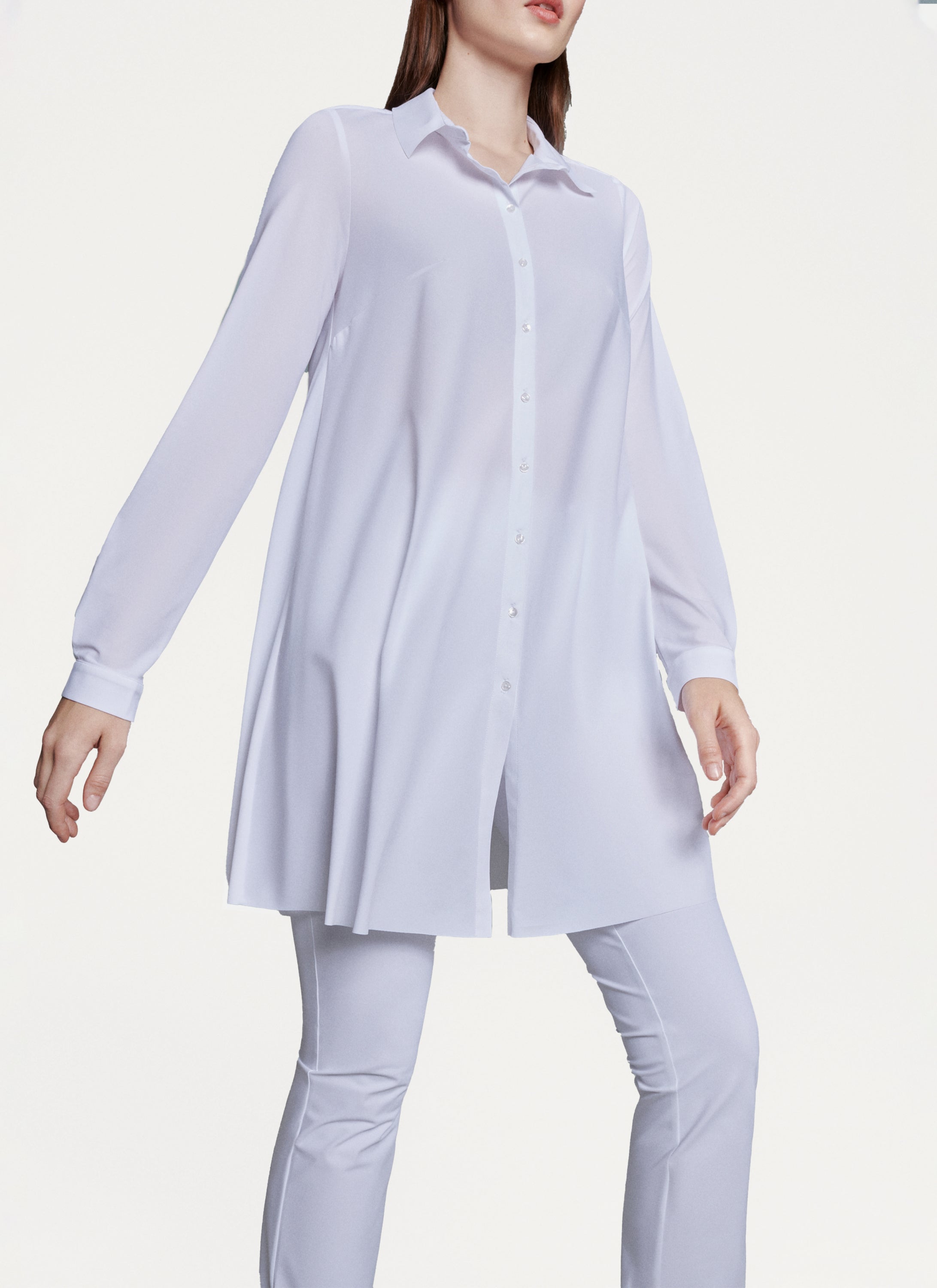 This A-line white long blouse is crafted from a lightweight, wrinkle-free travel jersey, providing a smooth and flattering fit. Featuring a classic button closure, this versatile blouse flows effortlessly along the body, perfect for both casual and business wear.