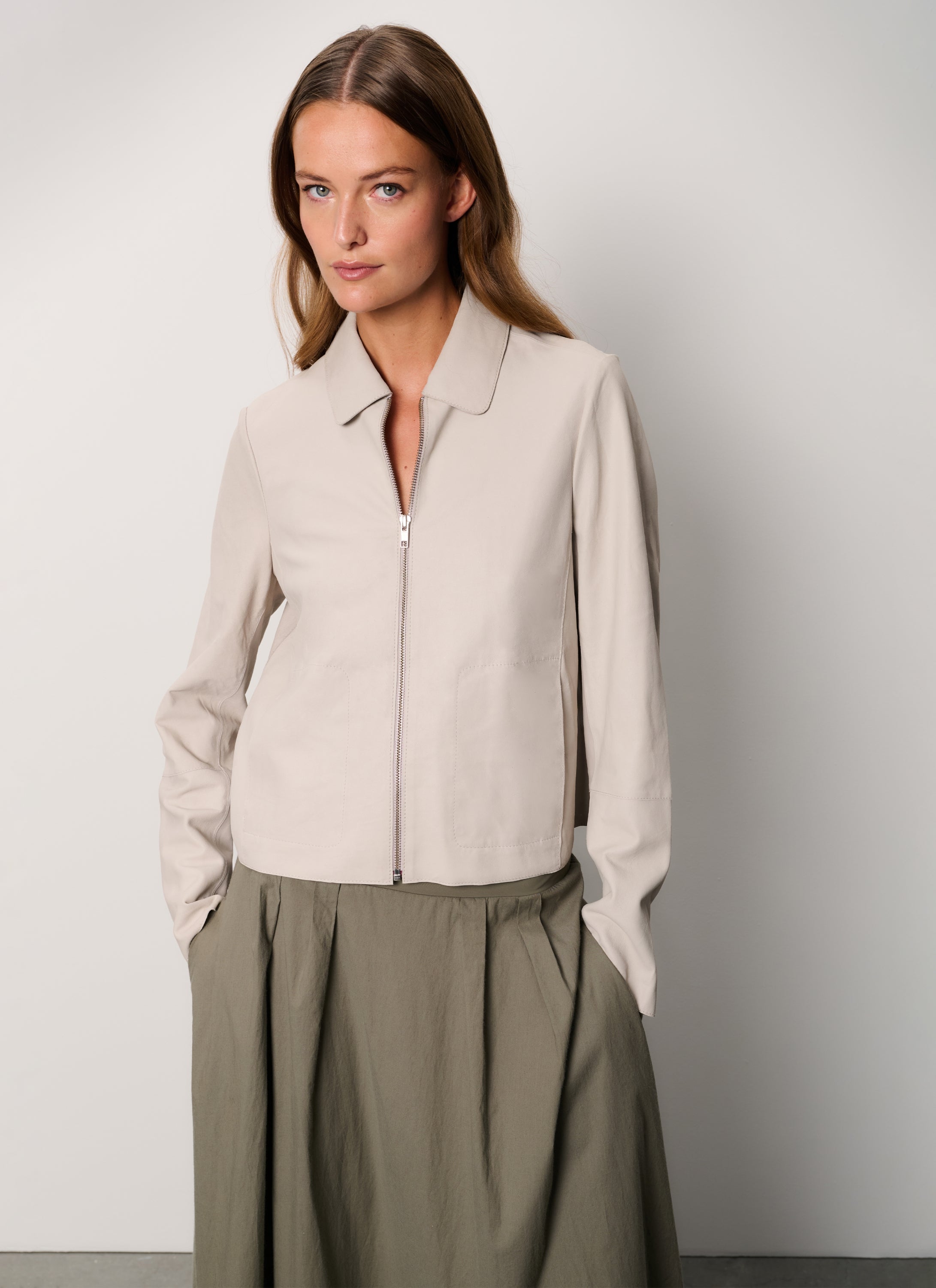 Crafted from luxurious goat nappalon leather, this jacket offers a smooth and sophisticated finish. With a straight fit and a clean zipper closure, it combines modern style with timeless appeal. Perfect for both casual and elevated looks, this jacket adds a refined touch to any outfit.