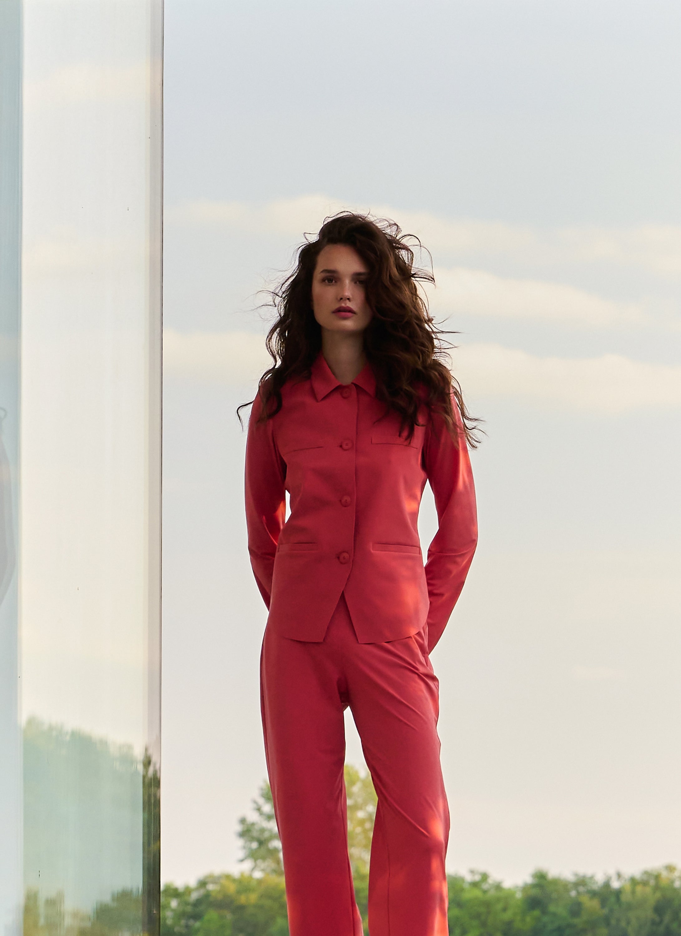 Add a bold pop of color to your wardrobe with this paradise pink jacket. Featuring a sleek standing collar, functional front pockets, and three buttons for a clean, tailored look. Perfect for a statement piece, this jacket pairs beautifully with the Msami trousers to complete the look.