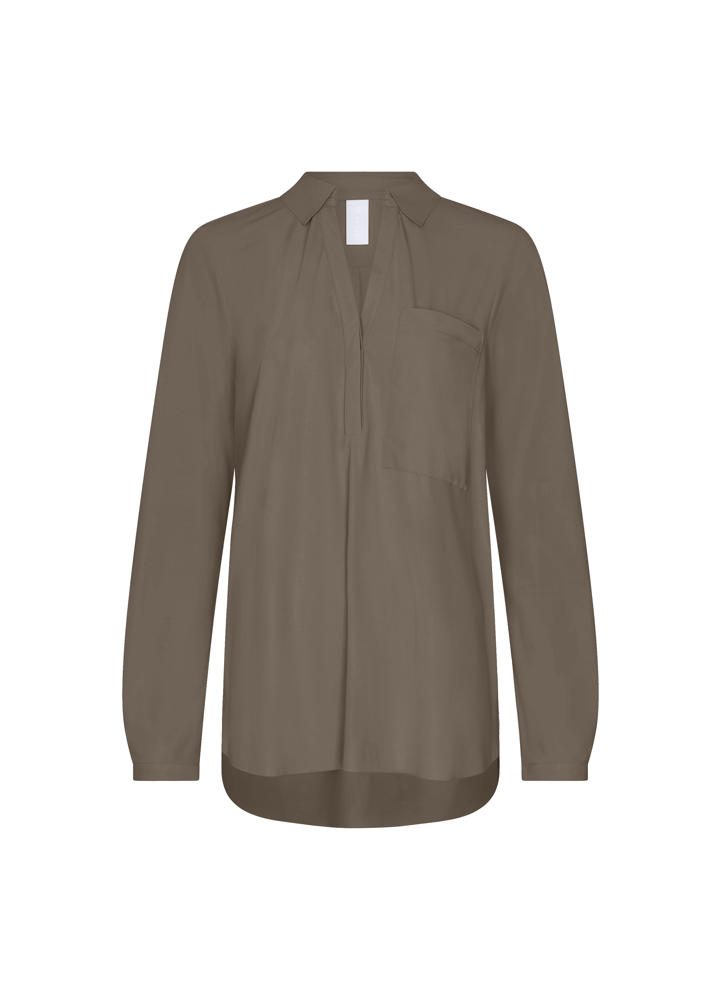 Explore the taupe Simplistic blouse from Japan TKY. Designed with a pointed collar, partial button closure, and subtle dipped seams for a sleek and minimalist look.