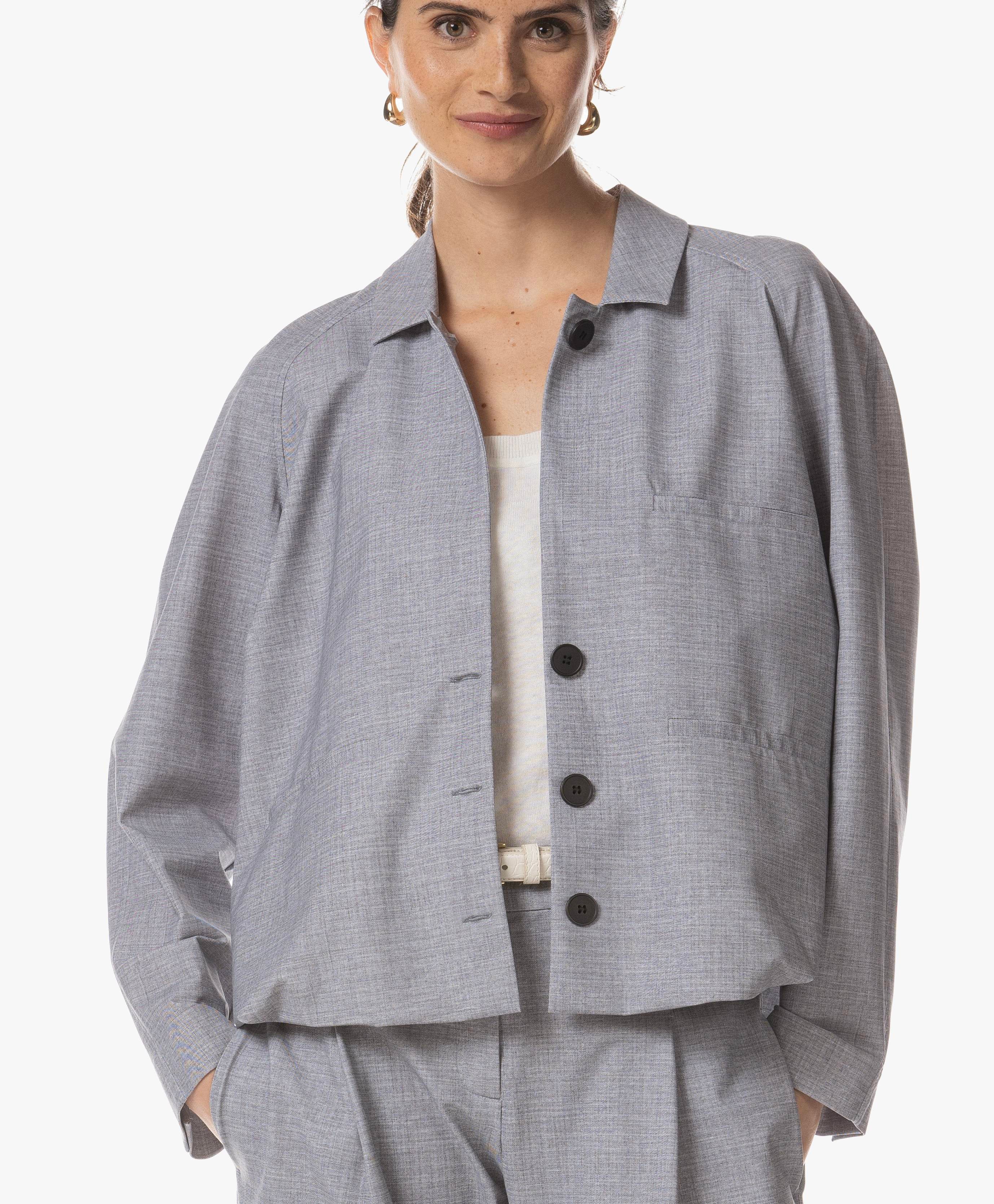 The Makoto Dessin jacket stands out through its refined details. Crafted from soft comfort travel jersey, it features a textured grey print that gives it a rich, sophisticated look. Designed with raglan sleeves, piped pockets, and button fastening, this short jacket offers minimalist elegance with a contemporary twist. A stylish statement piece for every season.