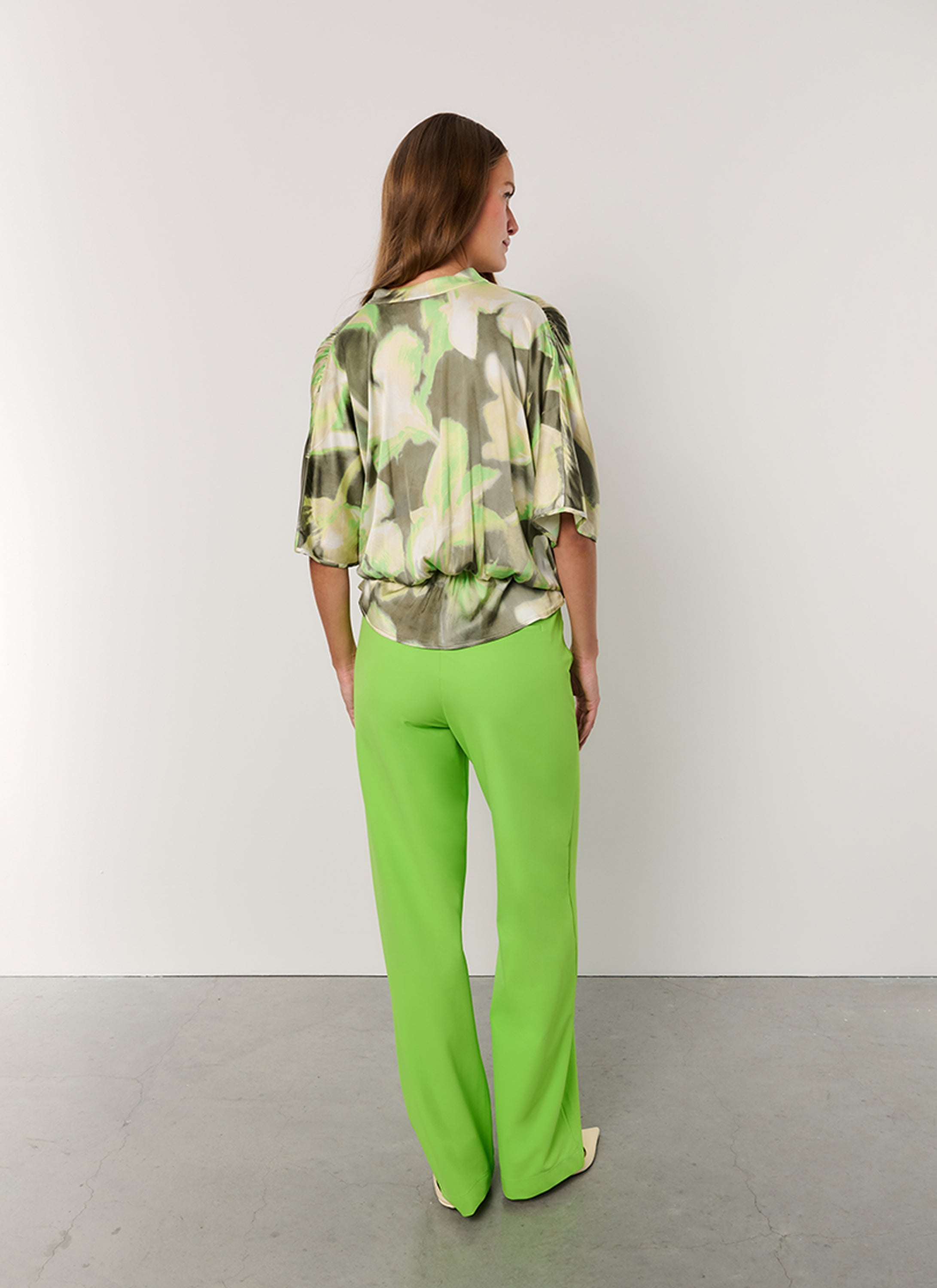 Elevate your wardrobe with the Wary pants in vivid green, crafted from a luxurious heavy travel jersey. These trousers feature a modern straight-leg design that flatters all body types while ensuring optimal comfort. The elastic waistband at the back provides a secure fit without compromising style, making them perfect for all-day wear. Pair the Wary pants with the matching Fusami blouse to complete the look.