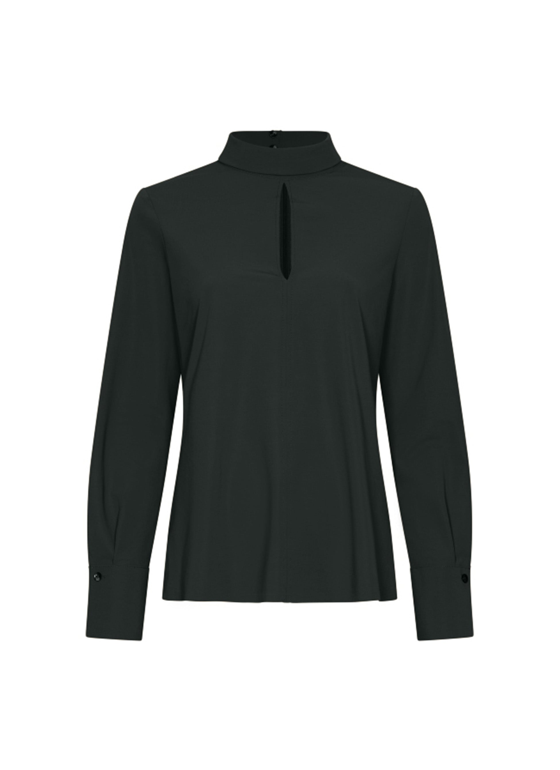 Minimalist and stylish, that is the Rion top. Made from regular travel jersey, it beautifully highlights the relaxed fit. The top features a split detail at the neckline, a folded mock neck, stitched seams at the front and back, and a button closure at the back of the neck.